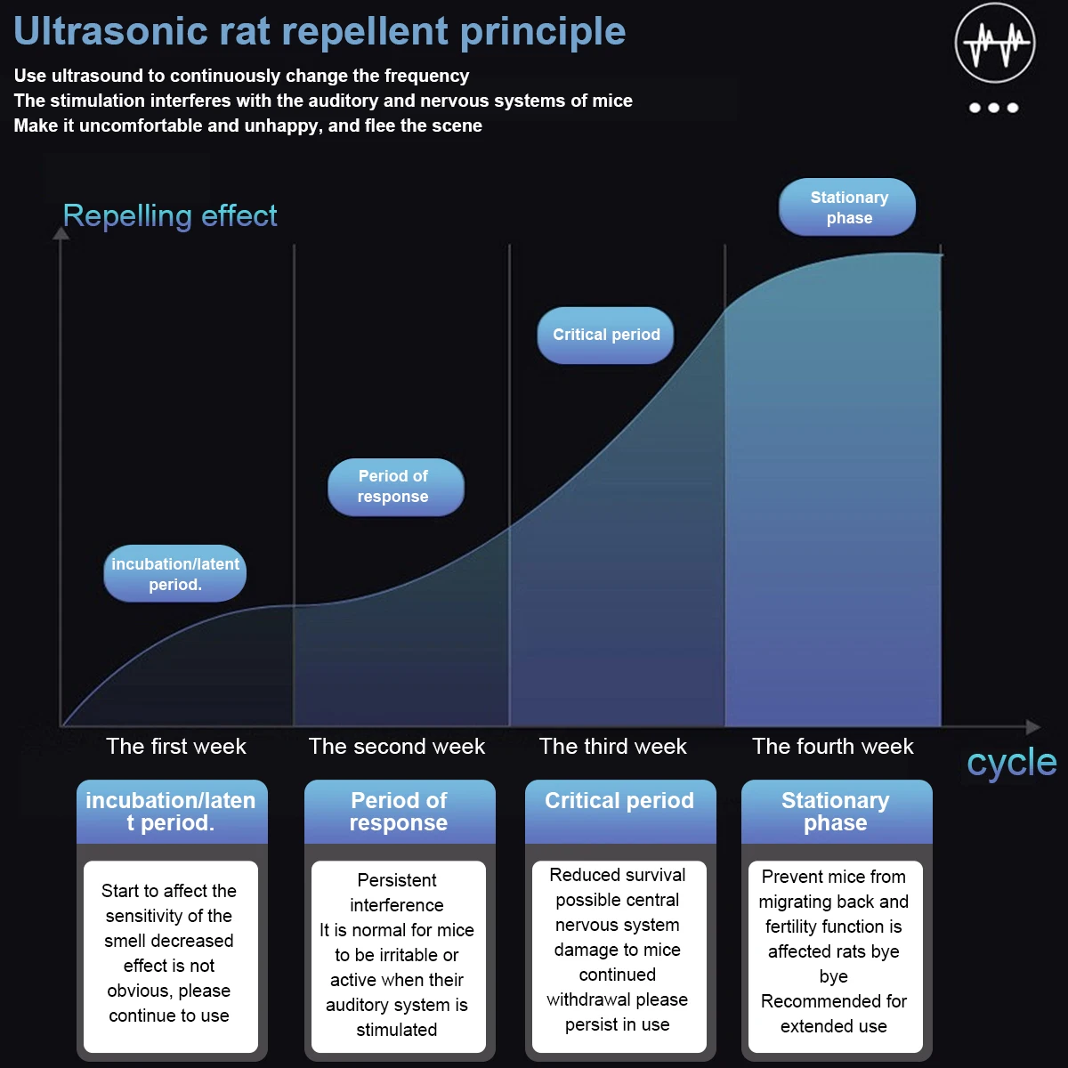 4)It's normal that the mouse and vermin will increase at the beginning of the using days because they are getting away from the living place after the attack of the ultrasonic. Usually, it could take 3~4 weeks to notice results.