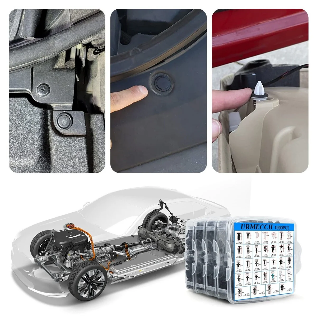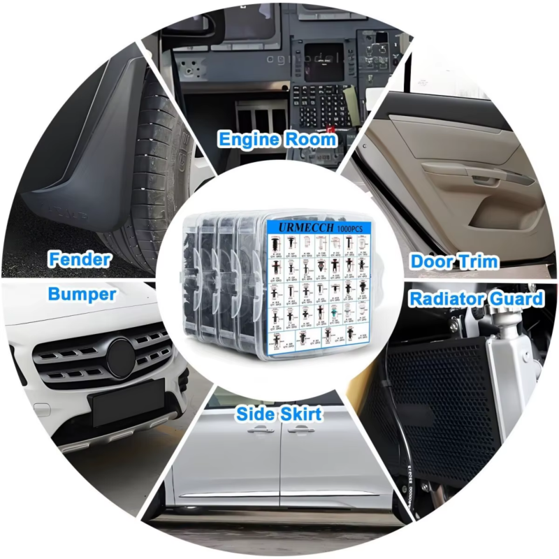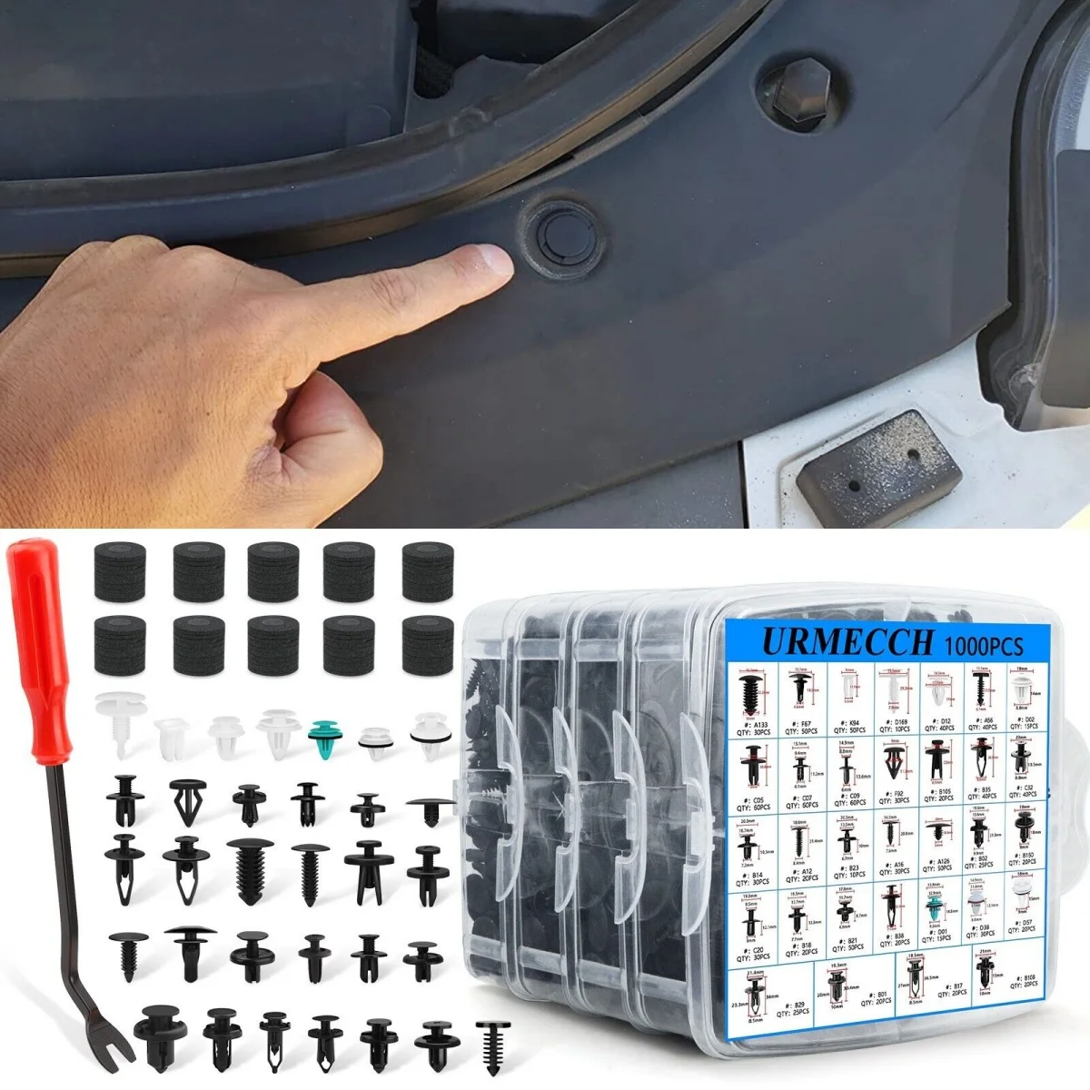 1. Total 1000PCS. Great Assortment Push Retainer Kit with 32 most popular sizesclips, 4 different kinds tools with 1 Fastener Remover and 100 spongy cushion, great for car audio, door panel, moldings, door trim, radiator shield yoke, fender, bumper and splash shield, window trims system installing or removing.