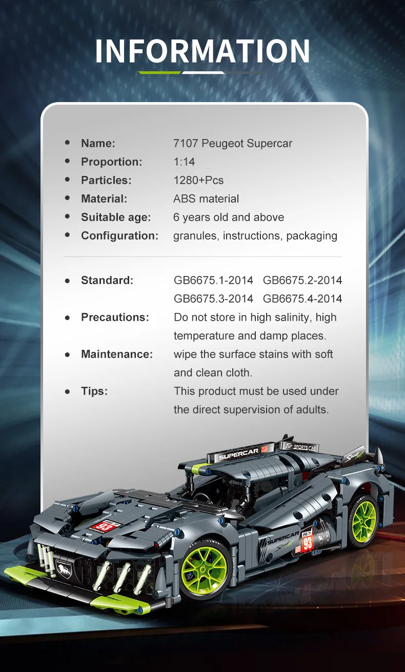 1280PCS Technical 1:14 Peugeoted 98 Speed Car Building Blocks 42156 Racing Vehi