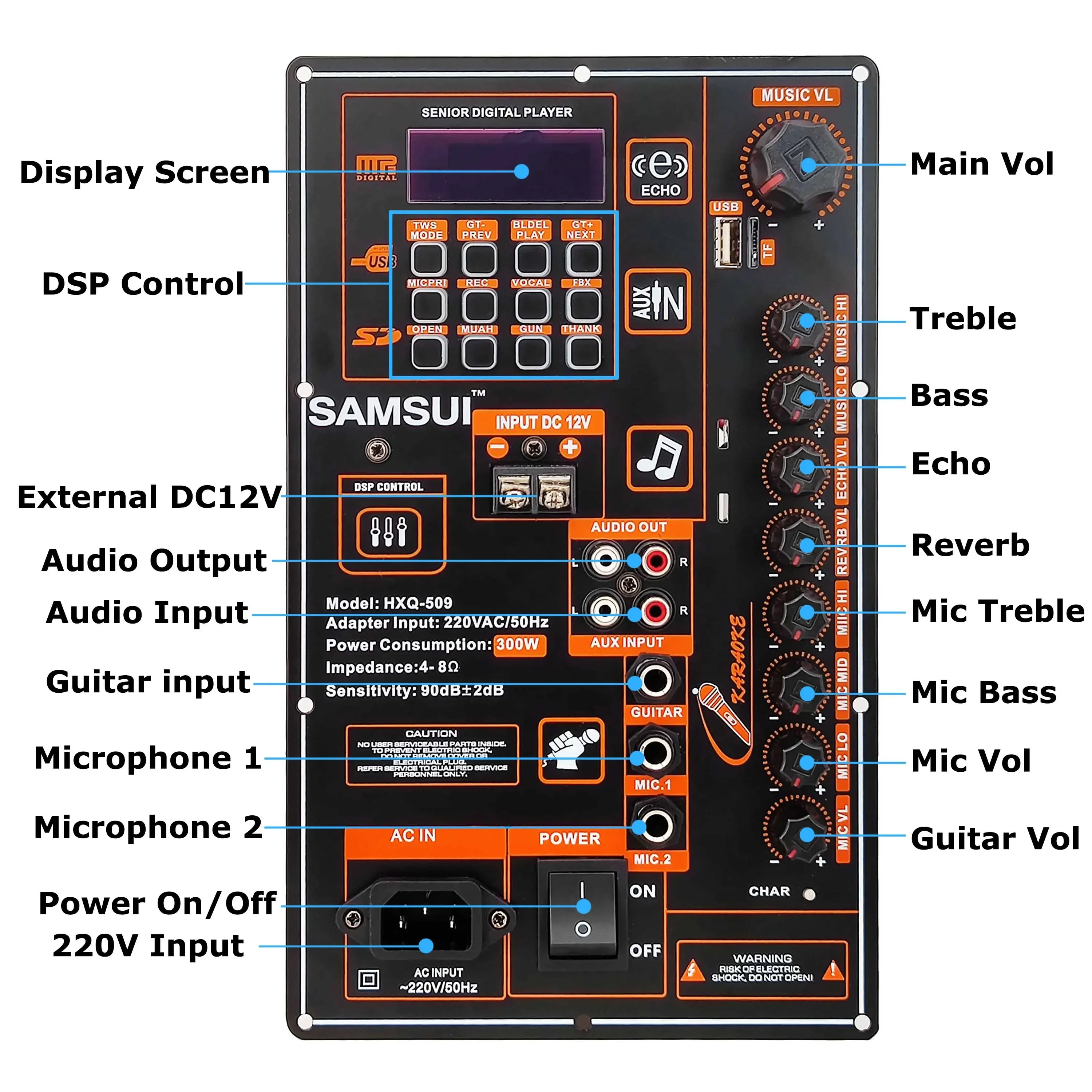 6. Panel Port: RCA Input*1, RCA Output*1, Guitar Input*1, Microphone Input*2, Power Input*1.