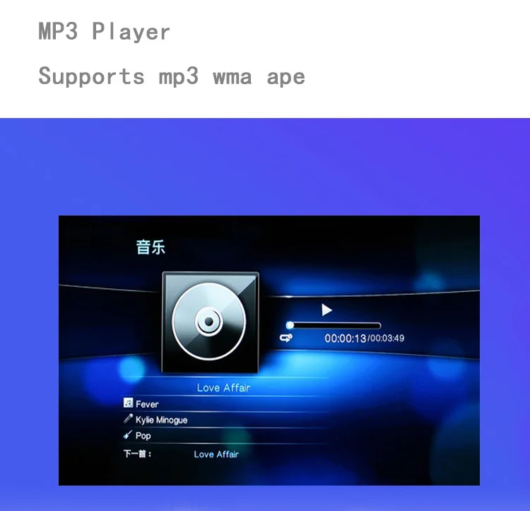 4. Audio supports MP3/WMA format, and pictures (baseline standard) support JPEG format and stereo audio output.