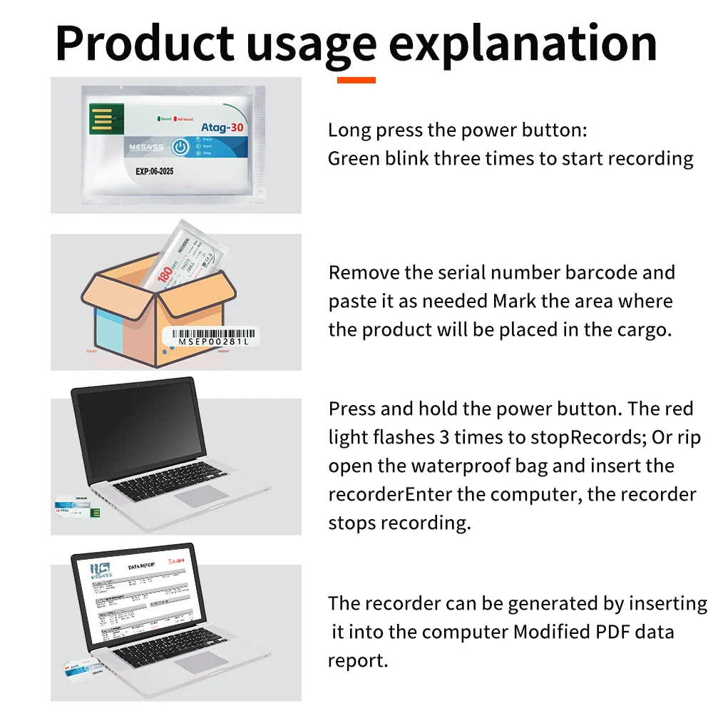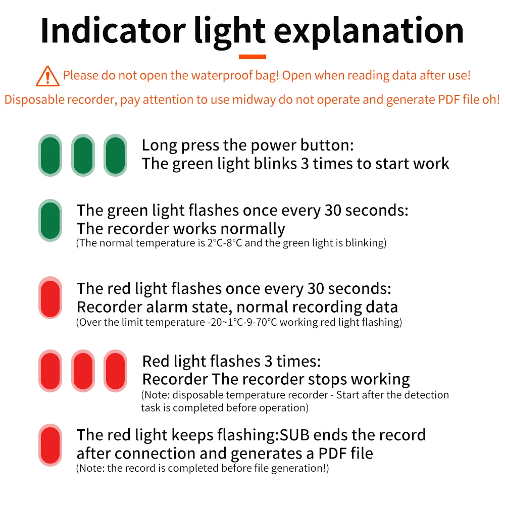 5.Stopping recording: Press and hold the button for 3 seconds, the red LED flashes three times, indicating the device has stopped recording. Alternatively, the device can be plugged directly into a computer's USB port to stop recording.