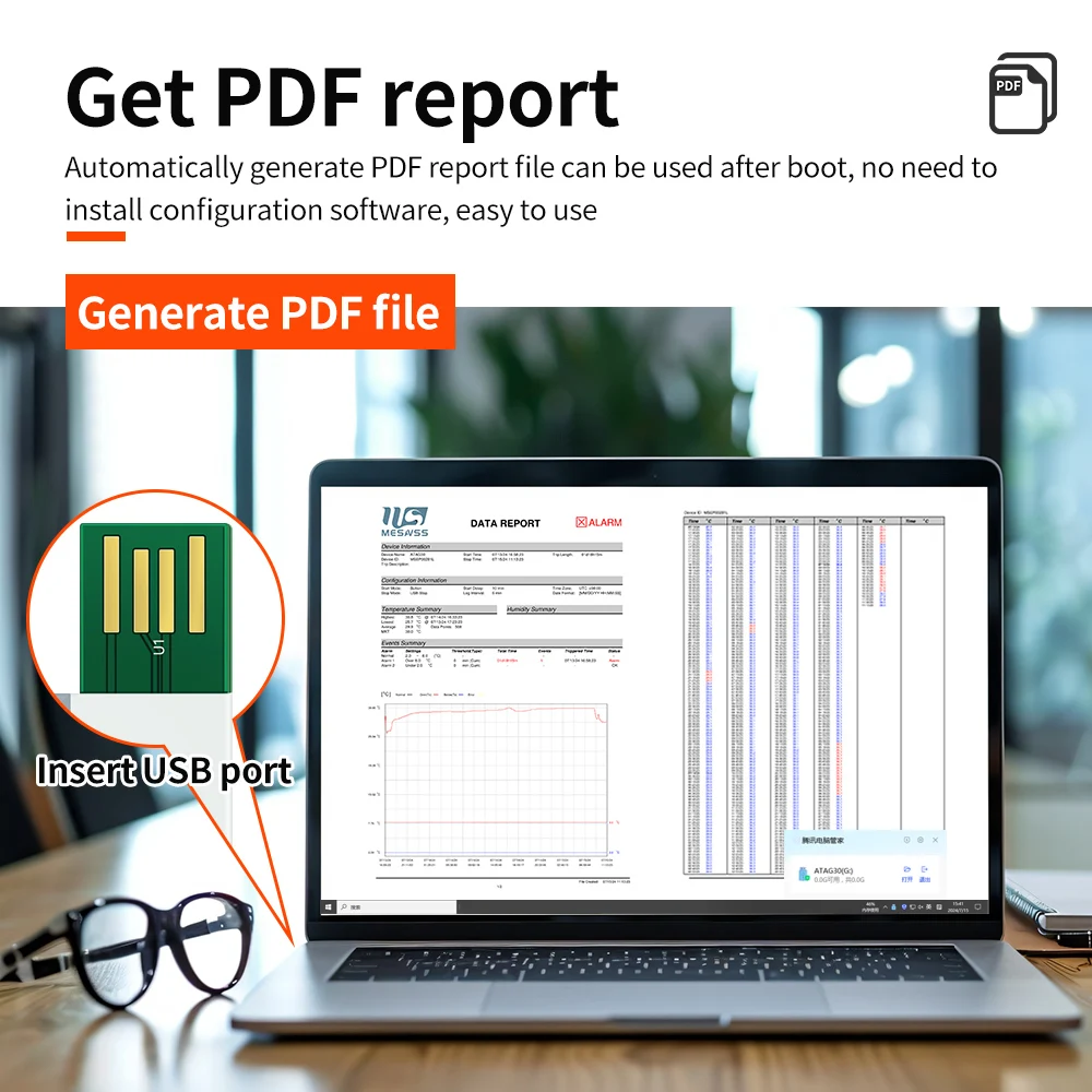 7.Initial connection to computer: When first connected to a computer, the green LED remains on until the report generation is completed, after which it turns off, and the red LED starts flashing. At this point, the computer will detect a USB drive containing reports in PDF/CSV format.