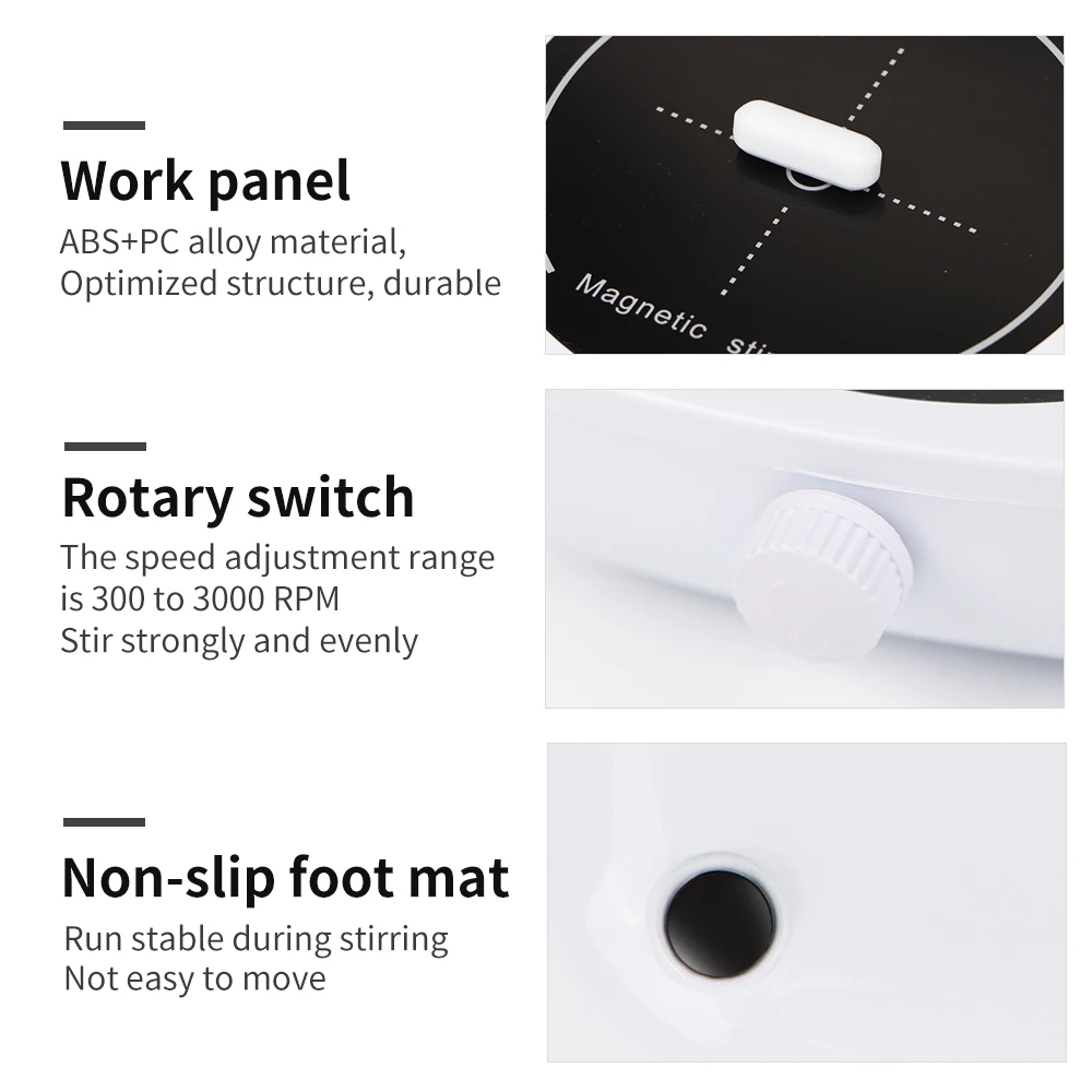 [SMALL SIZE,LARGE CAPACITY ]The mini lab mixer requires little bench space when in use. The anti-slip foot pad prevent it from sliding around in your lab, home or workspace. This little chemical mixer has a powerful brushless motor and can hold up to 1000ml of liquid volume. The working pan diameter is 4.57inch, making it convenient for beakers and other vessels.