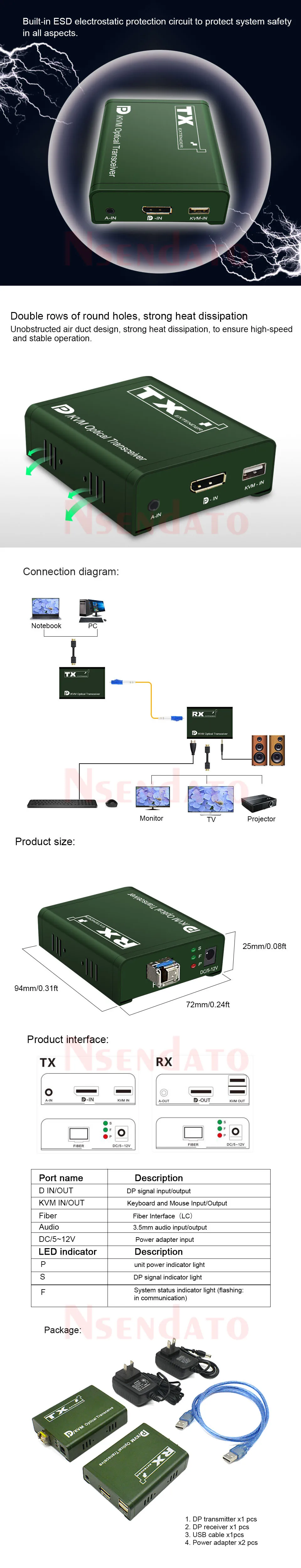 The Nsendato of DP extender provides extension of DP signals long distances over a single Fiber.It supports KVM,to operate remote devices using keyboard and mouse,embedded audio input and output.The extender can use for a wide range of applications requiring long distance transmission of high resolution with high quality by its good stability and powerful security.