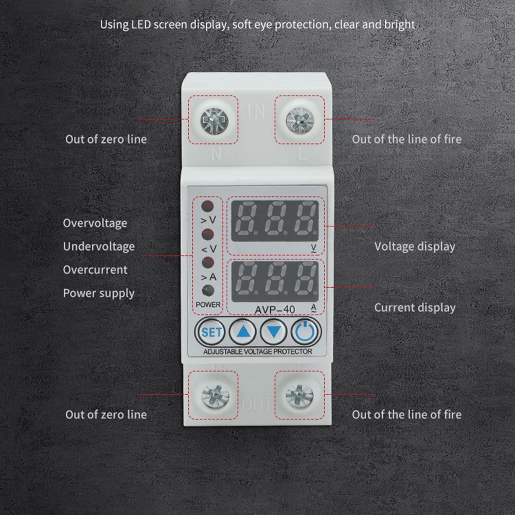 3.Overcurrent Protection: The relay protector features adjustable overcurrent protection between 1A-40A/63A. With a default setting of 20A, it provides security from short-circuits or overload conditions.