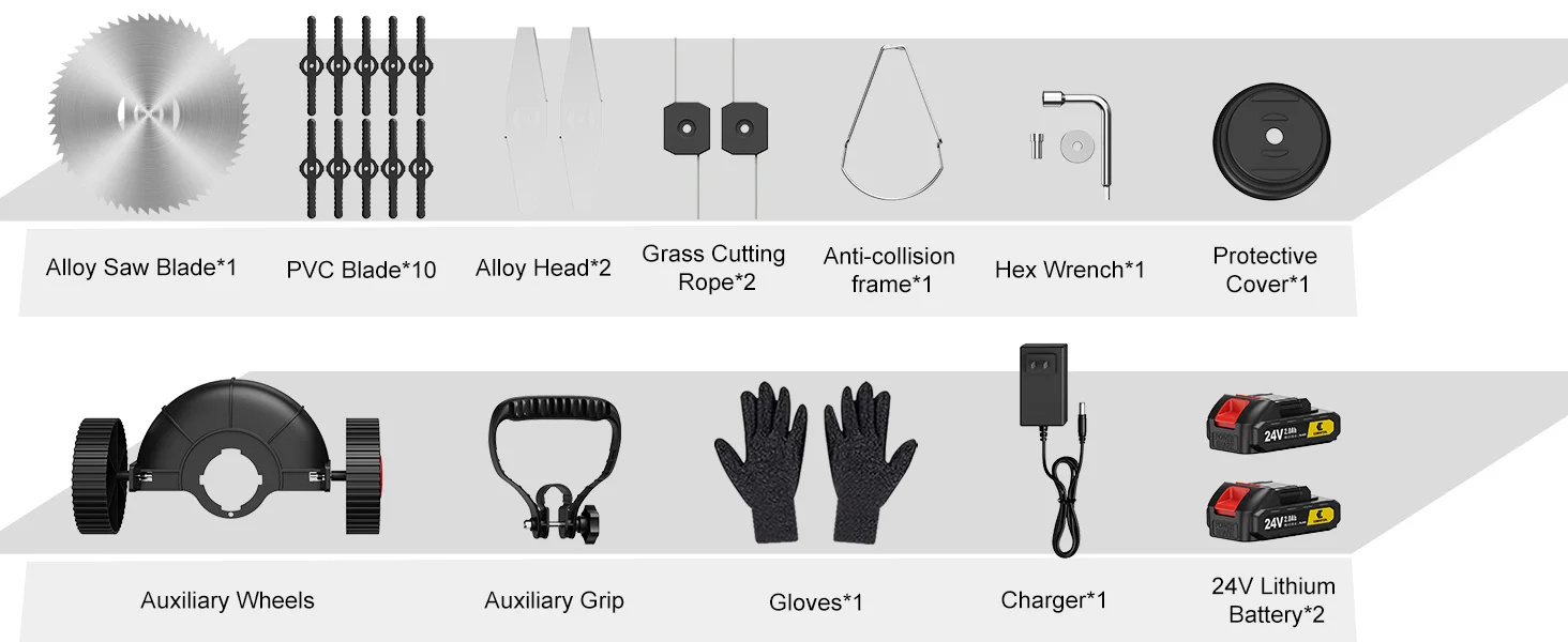 This all-inclusive package provides everything you need to get started right away. It includes:1 grass trimmer