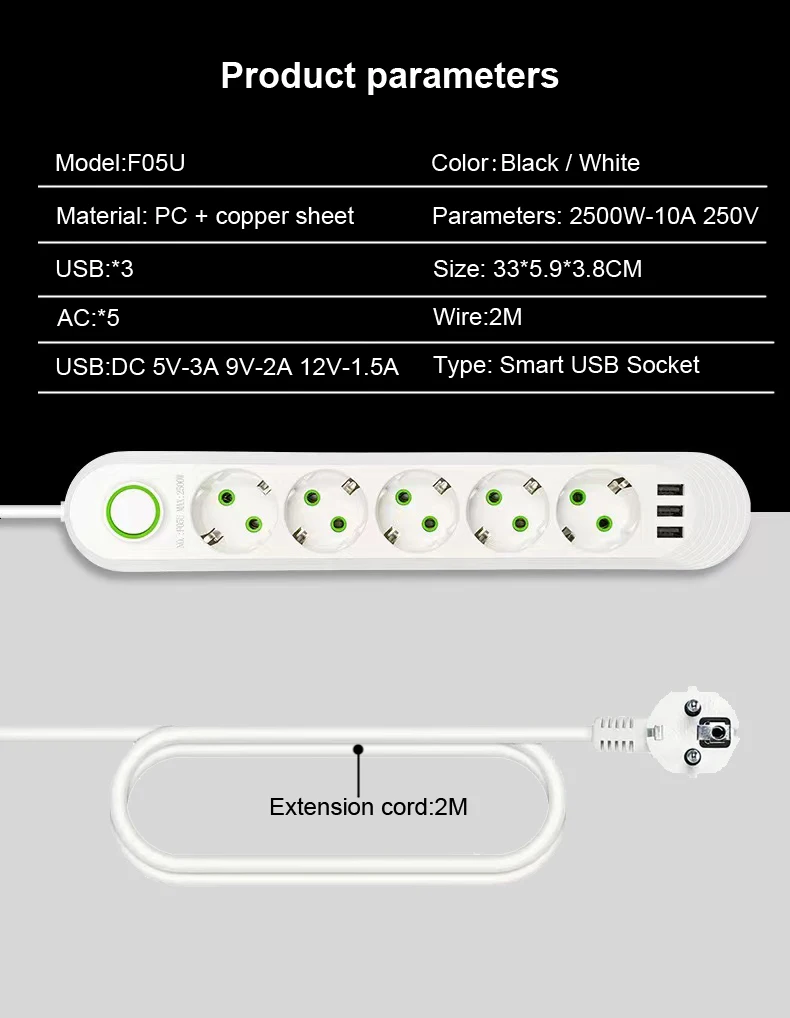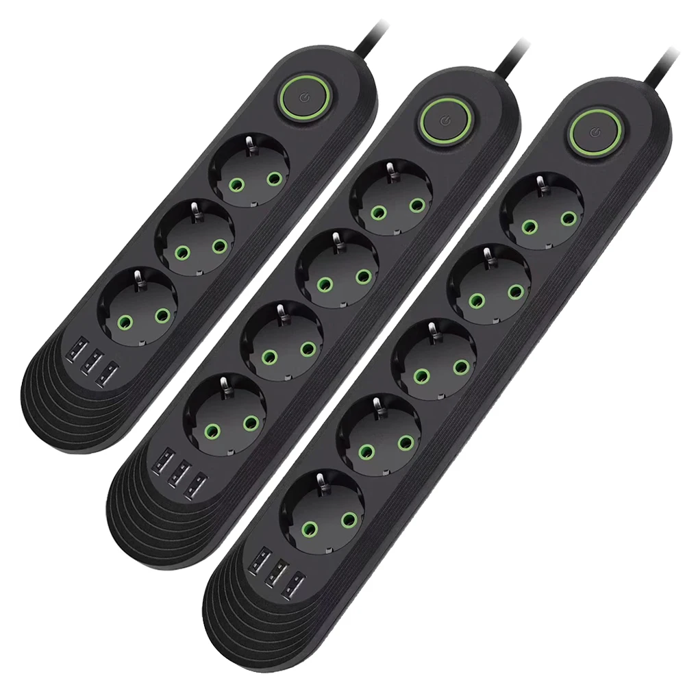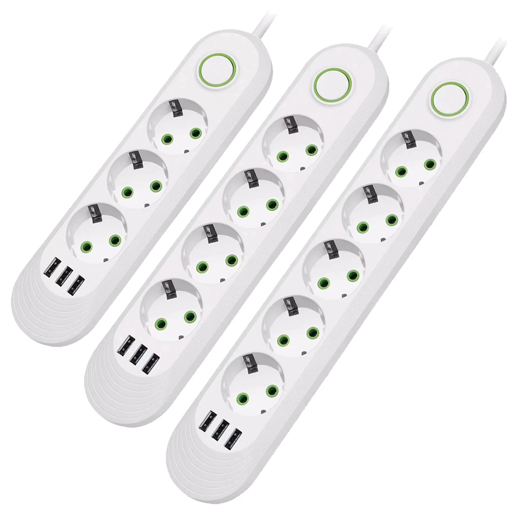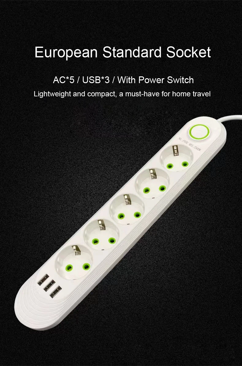 2500W EU Plug AC Outlet Multiprise Power Strip 2M Extension Cord Electrical Sock