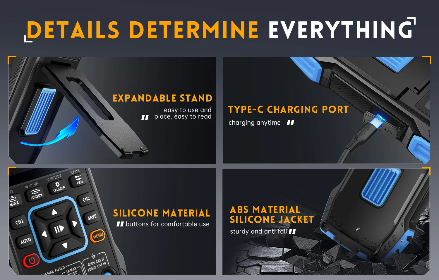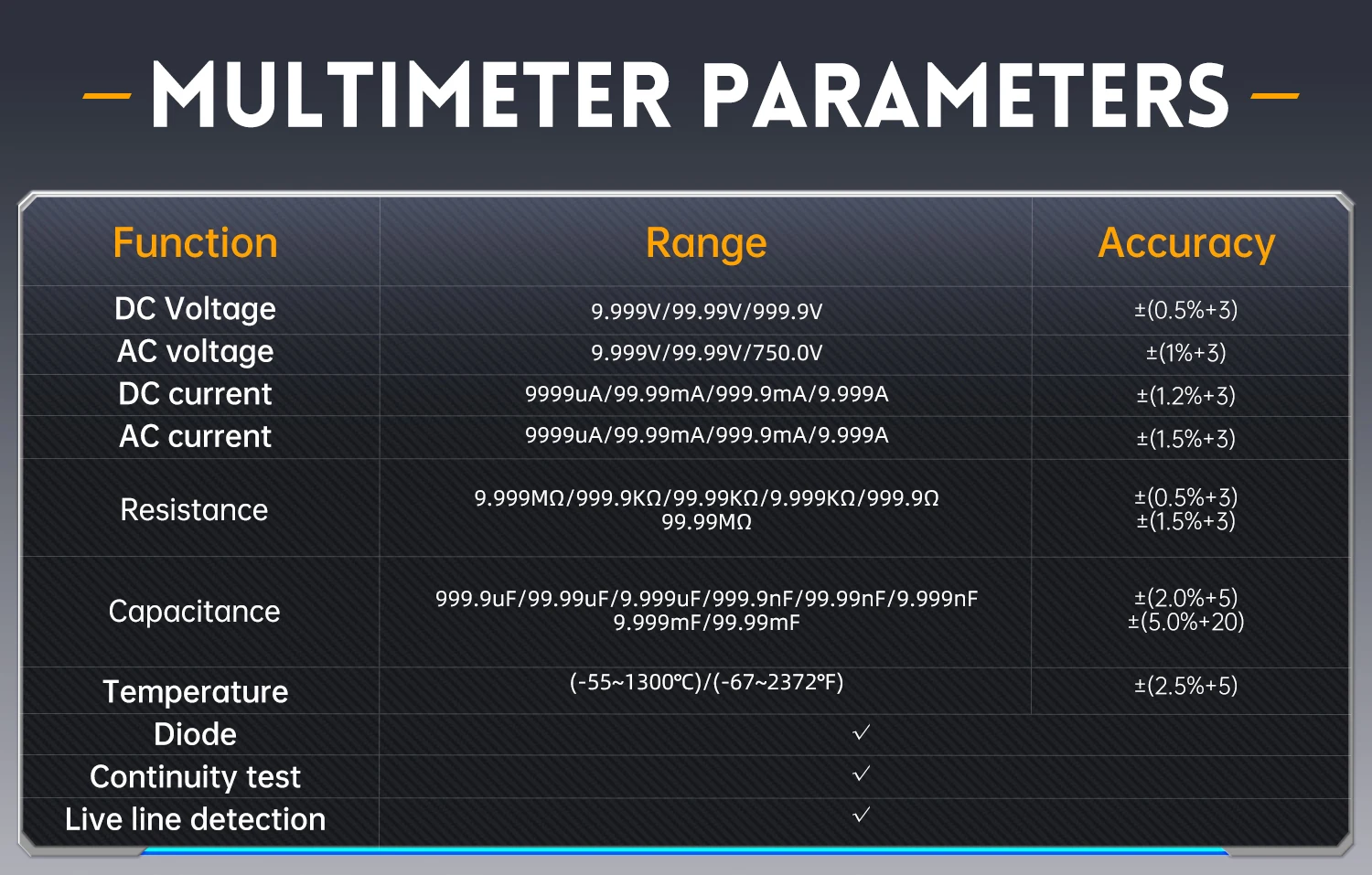 Support for saving and viewing waveform screenshots for analysis .The multimeter has a 4-digit 10000 point true effective value and supports AC/DC voltage and current measurement, as well as capacitance, resistance, diode, on/off and other measurement functions.