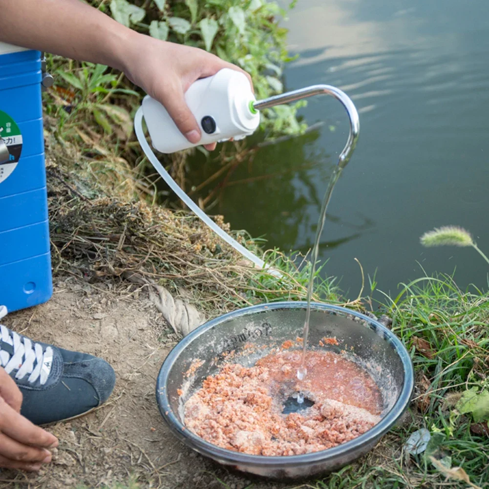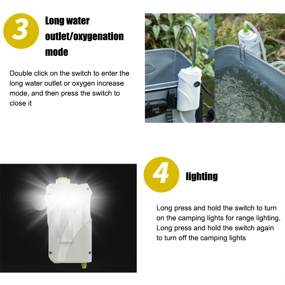 Feature: 1. Intelligent Mode: One press on the switch activates the standby mode with a green indicator light. Place your hand in front of the sensor to automatically dispense water. Remove your hand, and the water flow stops automatically. This convenient smart feature of oxygenation air pump is perfect for washing hands when they get dirty during fishing. 2. Tilt Mode: One press on the switch activates the standby mode with a green indicator light. Tilt the device, and hand-washing fishing gearautomatically dispenses water. Return the device to an upright position to stop the water flow. This tilt mode is ideal for bait blending or other pouring needs. 3. Continuous Water Flow/Oxygenation Mode: Double-click the switch to enter either the continuous water flow or oxygenation mode. Press the switch again to deactivate. The continuous water flow provides a large pumping capacity, while the instant oxygenation ensures the fish have ample oxygen supply, meeting their oxygenation requirements 4. Lighting Mode: Long press the switch to activate the camping light, which provides broad illumination. Long press the switch again to turn off the camping light. The durable battery ensures long-lasting lighting for nighttime fishing or as a bait light. 5. Portable Design: This fishing water pump is compact and easy to carry, making it suitable for outdoor activities such as fishing, camping, and hiking. With its multifunctionality, it serves as a reliable companion for all your fishing adventures. Specification: Origin: Mainland China Power Source: Battery Product material: ABS material Product color: white, black (optional) Product size: 142mm/5.59in x 73mm/2.87in x 39mm/1.54in Manual measurement, there will be a slight error! Note: |