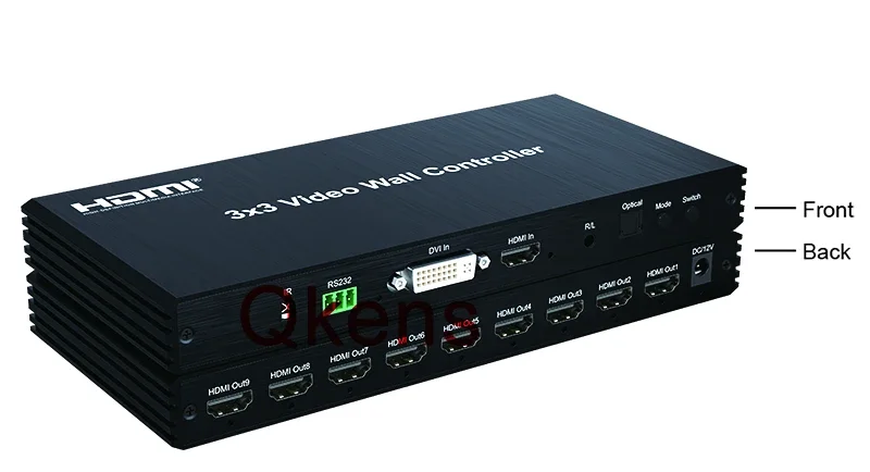 This 3x3 video wall controller, supports 1 HDMI/DVI input and 9 HDMI outputs, the main function is to divide