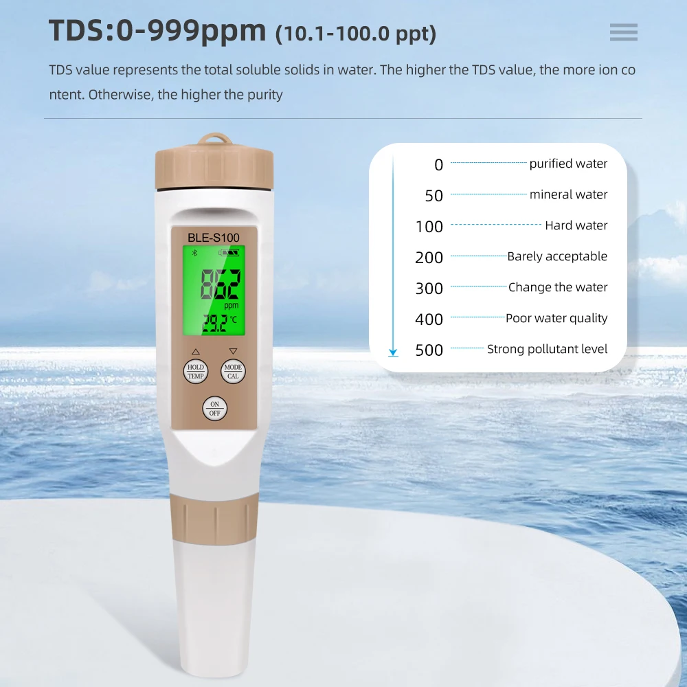 1. Measures Potential Electrical conductivity (EC), Total Dissolved solids (TDS), percentage of salt, seawater salinity and temperature.
