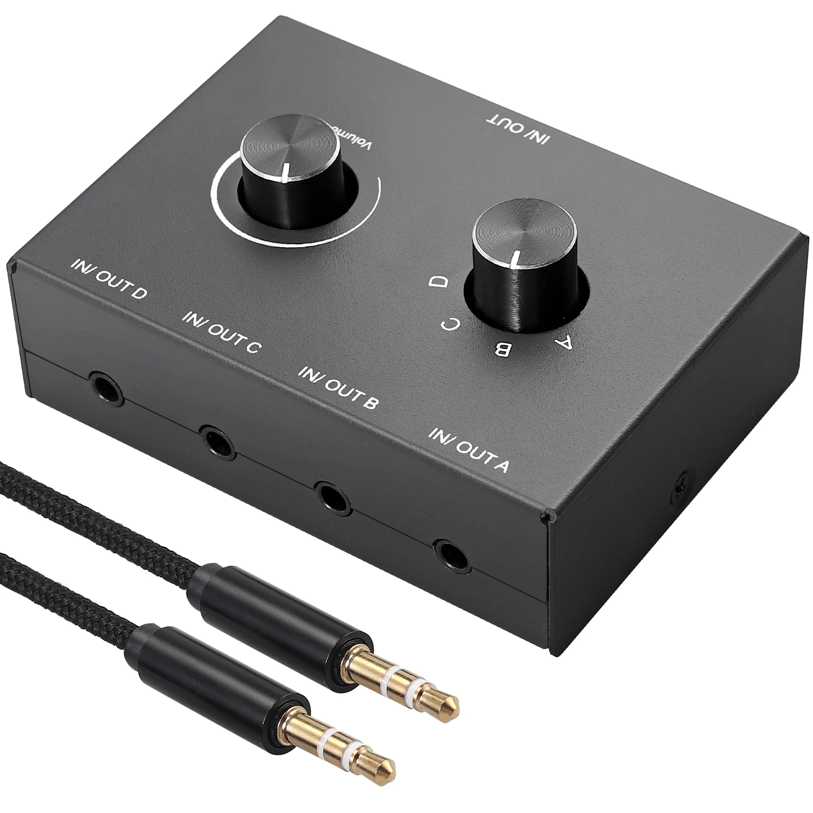 Select audio input between (IN/OUT)A/B/C/D with 1/4 switch knob and get one output;