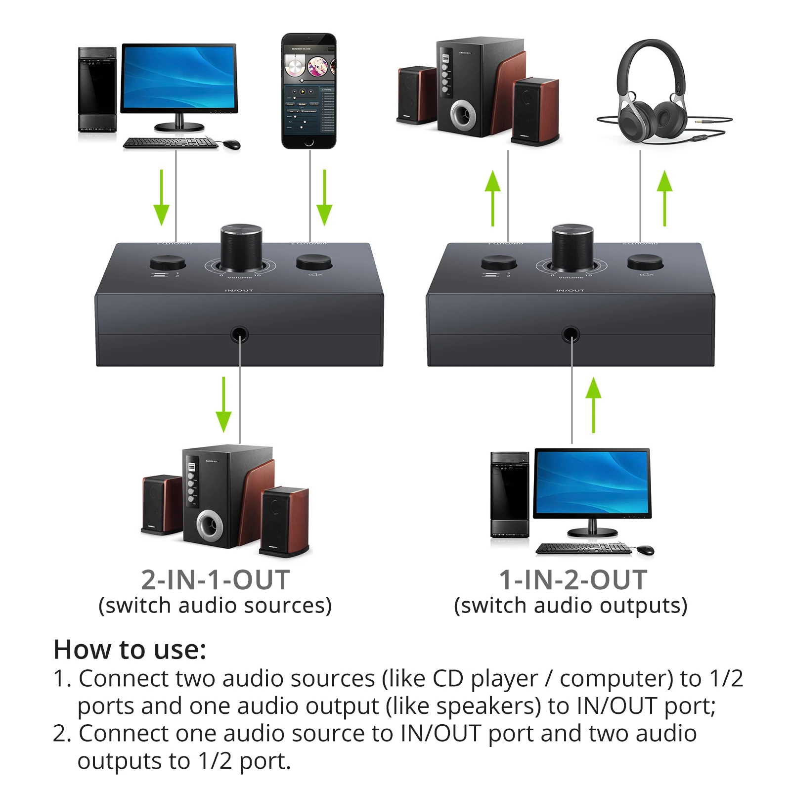 connect two audio sources (like CD player / computer) to 1/2 ports and one audio output (like speakers) to IN/OUT port;