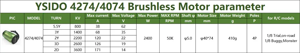 YSIDO 4274 800KV 1400KV 2200KV 3600KV Brushless Motor for RC ARRMA TRAXXAS EDF Boat 1/8 1/7 Car Monster Truck Off Road