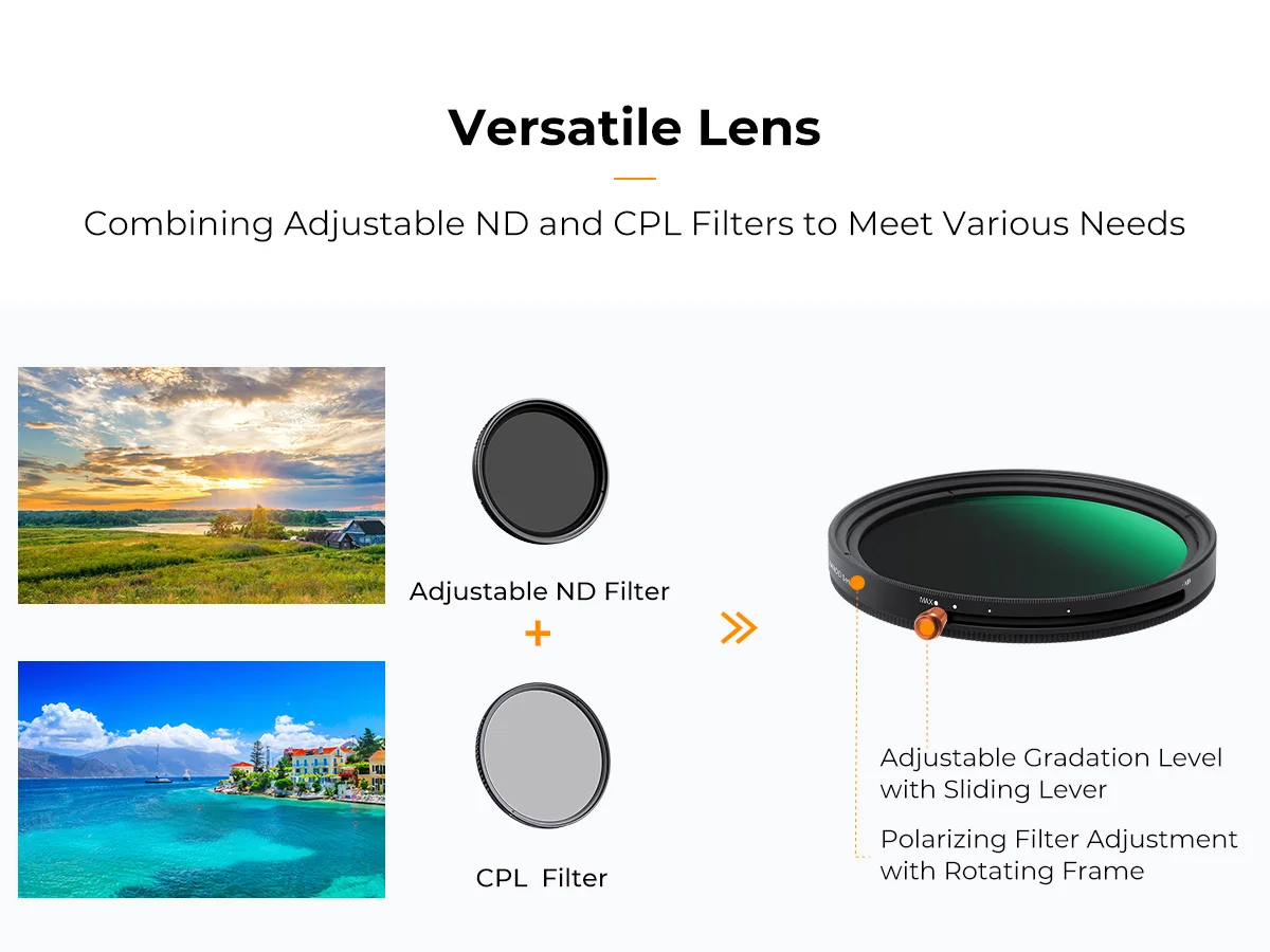 One filter has both of CPL and varaible ND filter function,save your time to replace two filters; it can not only reduce the amount of light entering the lens but also darken skies, manage reflections at the same time.