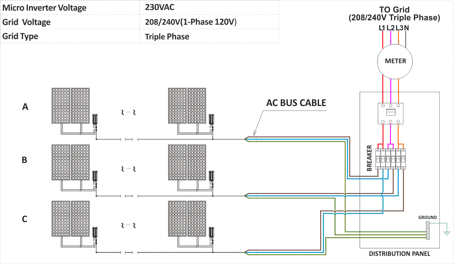 Step 2 - Connecting the Microinverter AC cable and connectiong to AC bus cable(L-BROWN,N-BLUE,GGREEN&YELLOW) one by one, Please do NOT exceed the Maximum current of AC bus cable .