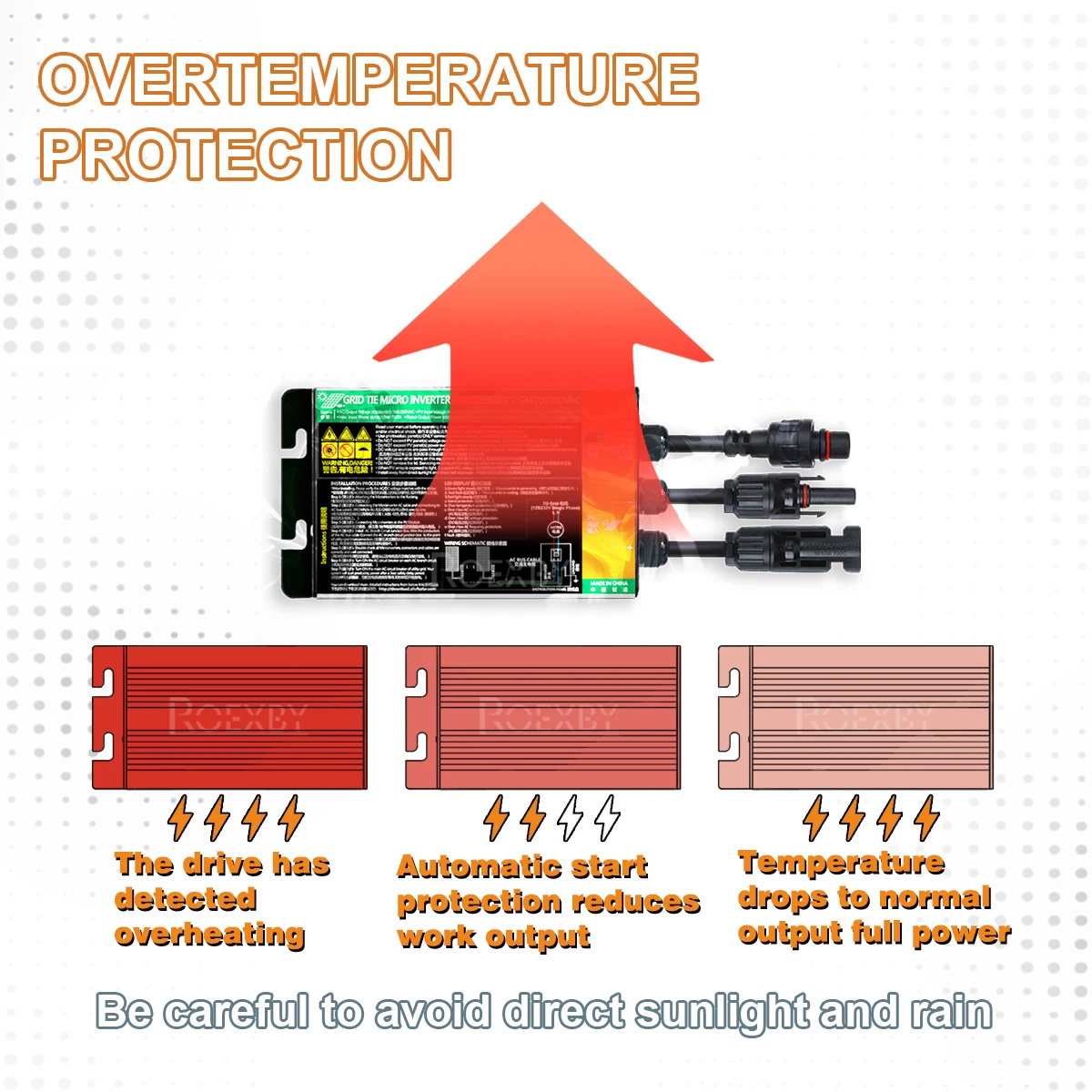 The inverter may generate heat during operation, which is normal. The inverter has over-temperature protection, and if the temperature is high, it will automatically reduce the working output efficiency or stop working. After cooling down, it will restart.