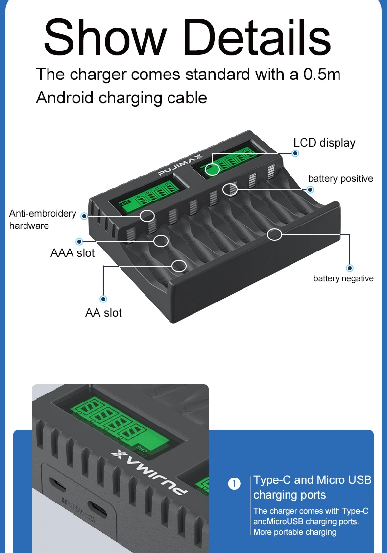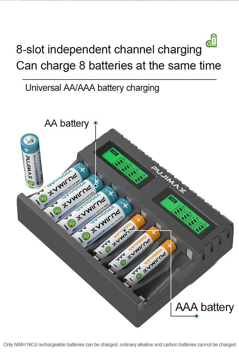 --1. This charger can charge 1-8 AA/AAA Ni-MH/Ni-Cd rechargeable batteries with on-screen power display