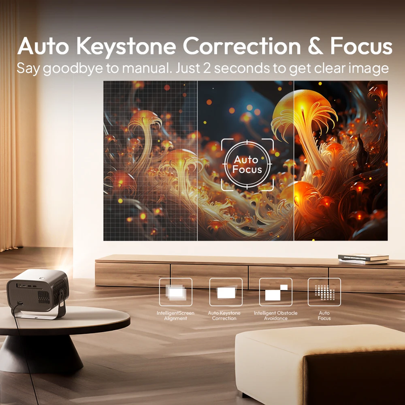 Autofocus ensures instant, razorsharp images without manual adjustment. Whether you move the projector or switch surfaces, it automatically maintains perfect clarity ideal for quick setups, gaming, and mobile use,and obstacle avoidance, the projector delivers a perfectly aligned, distortion-free screen in seconds, offering a hassle-free experience.