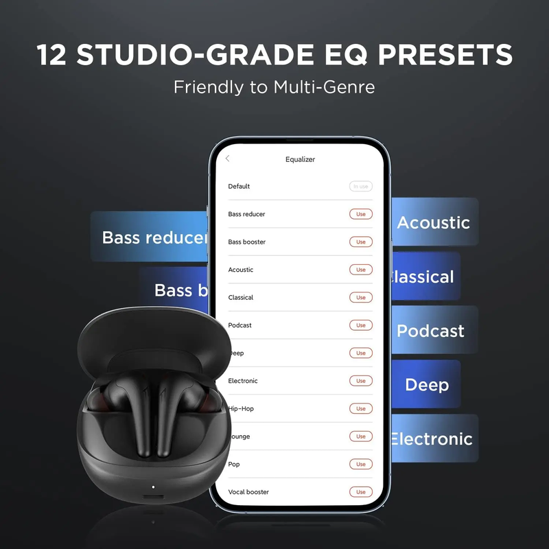 Find the ideal EQ to make your playlist enjoyable in the 1MORE MUSIC app. 12 studio-grade EQ presets from Sonarworks are created for various music genres, allowing the Aero to easily handle anything from rock to classical.