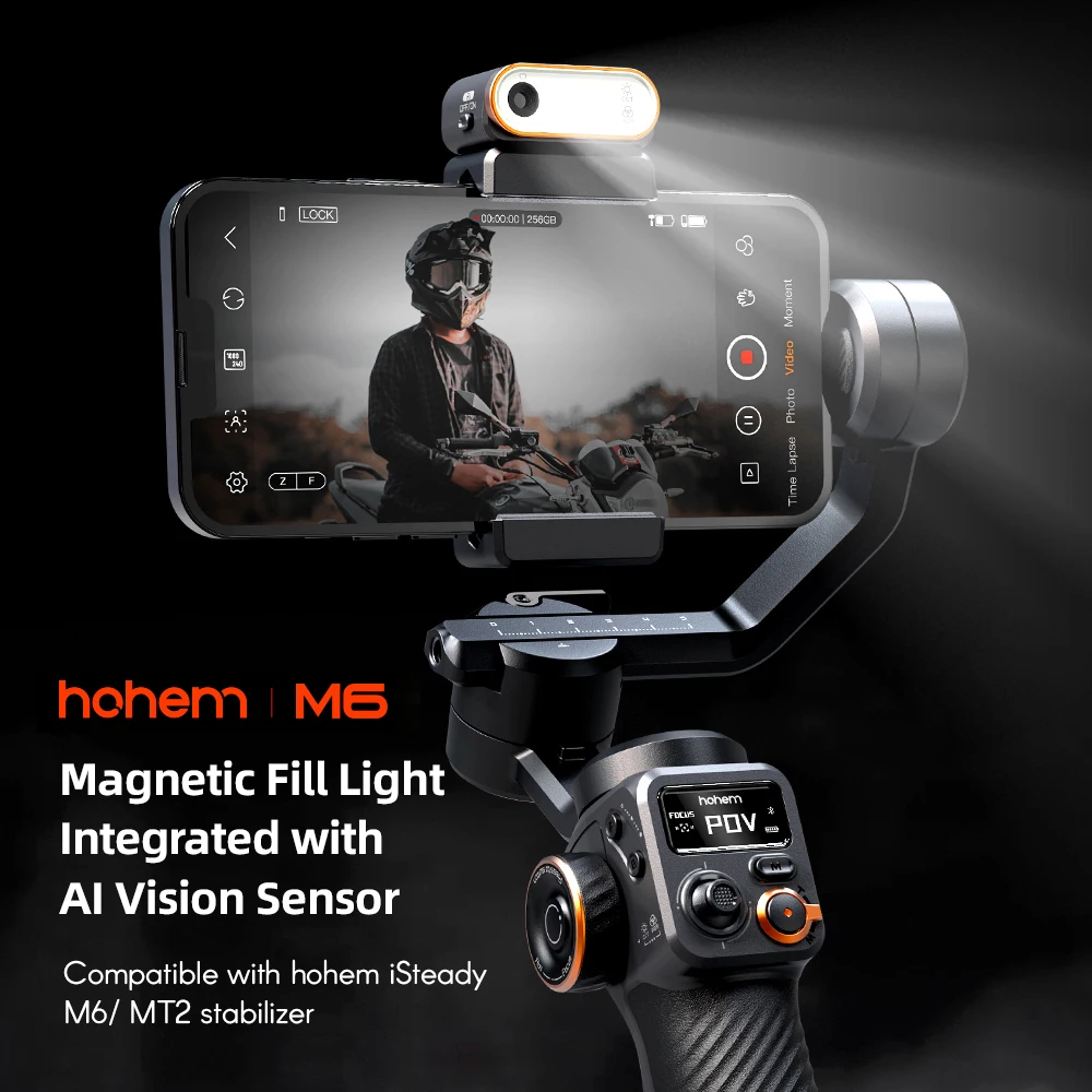 This magnetic fill light integrated with AI vision sensor is compatible with hohem iSteady M6/ MT2 smartphone gimbal stabilizer.