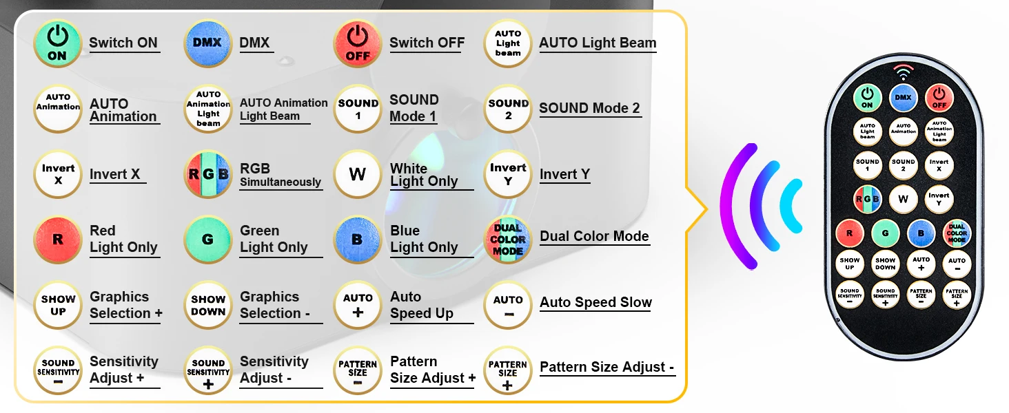 Play mode: sound activation, AUTO-BEAM, automatic animation, DMX, master/slave, PC control