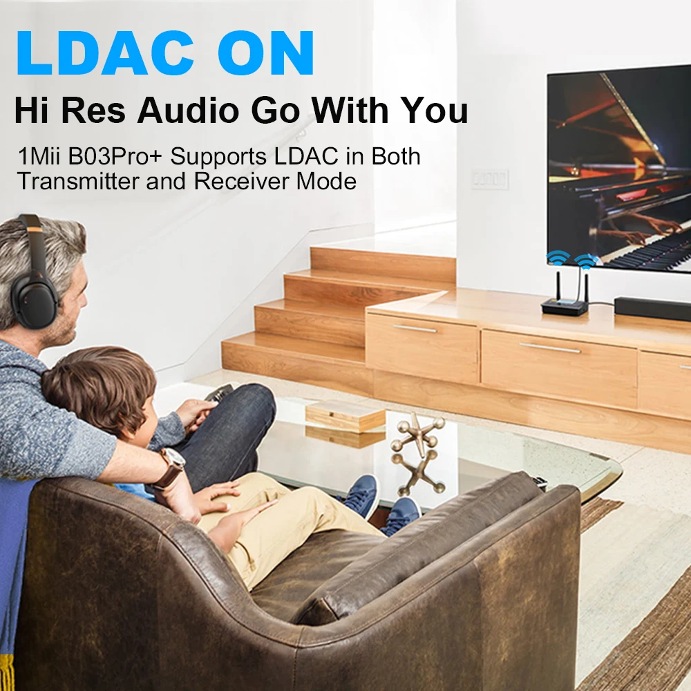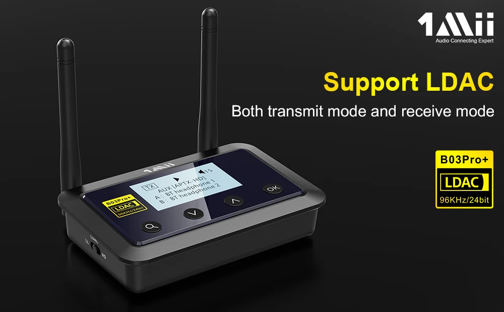 1Mii B03 Pro+ Bluetooth transmitter receiver Featuring the latest Bluetooth 5.0 (CSR8675) and support for LDAC, aptX HD,aptX LL, SBC and AAC decoding.