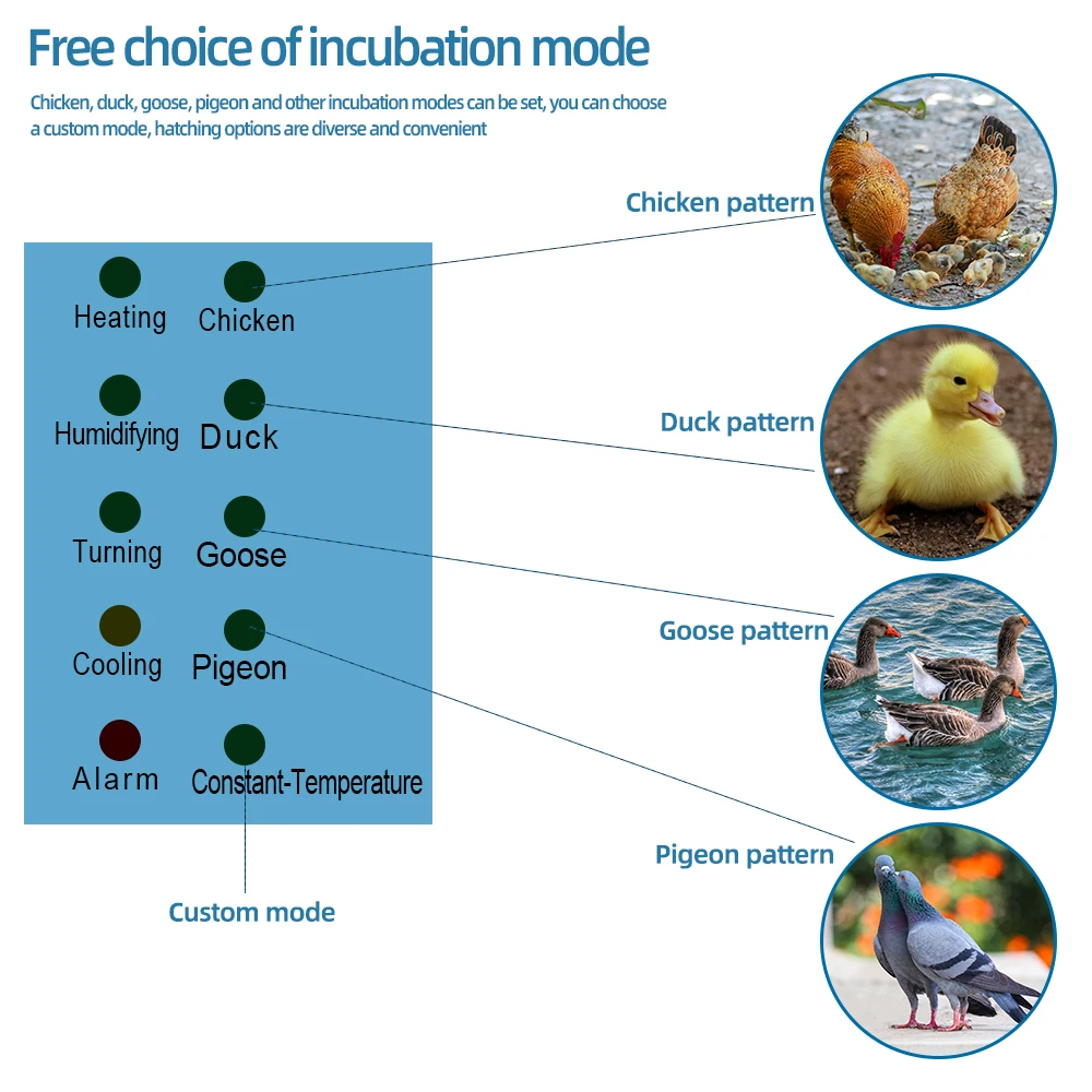 The new generation intelligent humiture incubator controller is a fully-intelligent microcoputer control system designed and developed for incubation industry and it applies the latest microelectronic technology and new type components.It applies the latest microconputer chips to have strong anti-interference and high stable performancethe teperature sensor applies the high precision sensor to have high temperature collection precision and wide temperature range;it applies high performance humidity sensor to high precision to effectively ensure the stableness and reliability.It has the design of user-friendly four screens for display including two screns displaying the temperature and humitity of incubator and other to screens displaying the egg turning times and incubation days by pressing the keys and displaying the preset teperature and humidity by pressing the keys.And five kinds of incubation modes for user-definition,chicken ,duck ,goose ,and pigeon are available for selection.