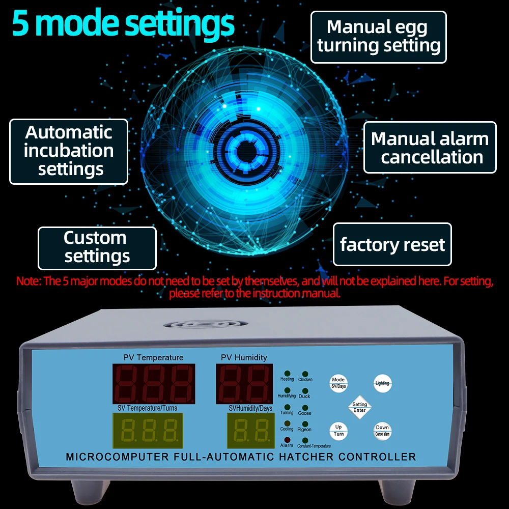 The new generation intelligent humiture incubator controller s a fully-intelligent microcomputer control system designed and developed for incubation industry and i applies the latest microelectronic technology and new type components. It apples the microcomputer chips to have strong anti-interference and high stable performance;the temperature sensor applies the high precision sensor to have high temperature collection precision and wide temperature range:it applies high performance humidity sensor to high precision to effectively ensure the stableness and reliability.It has the design of user-friendly four screens for display including two screens displaying the temperature and humidity of incubator and other two screens displaying the egg turning times and incubation days by pressing the keys and displaying the preset temperature and humidity by pressing the keys.And five kinds of incubation modes for user-definition,chicken,duck,goose and pigeon are available for selection.