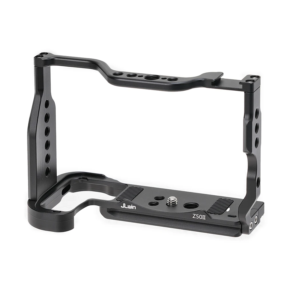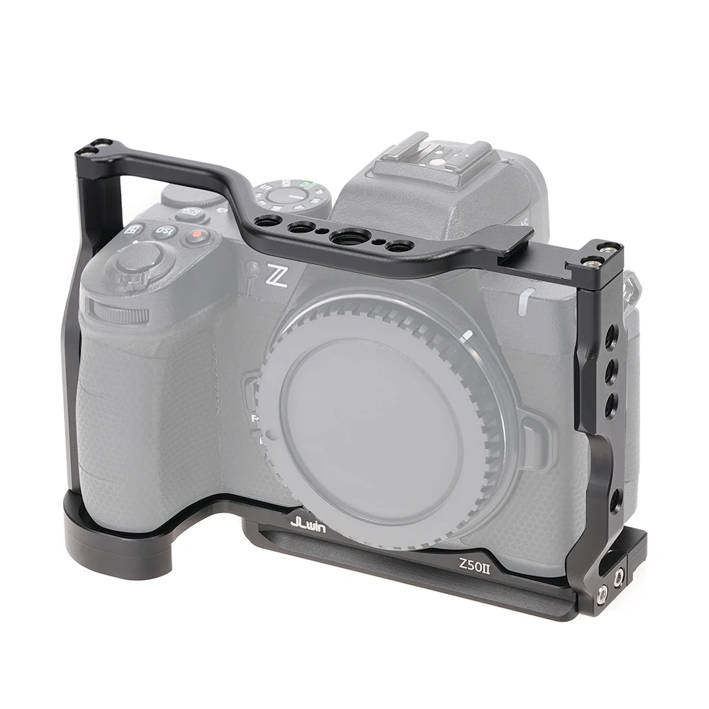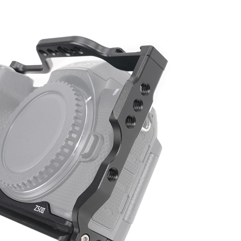 Aluminum Camera Cage is specifically designed For Nikon Z50II Camera. It is a full cage which is lightweight and perfectly form-fitting the camera. It is equipped with multiple 1/4" -20 and 3/8" -16 threaded holes, ARRl locating hole and cold shoe for accessories mounting.