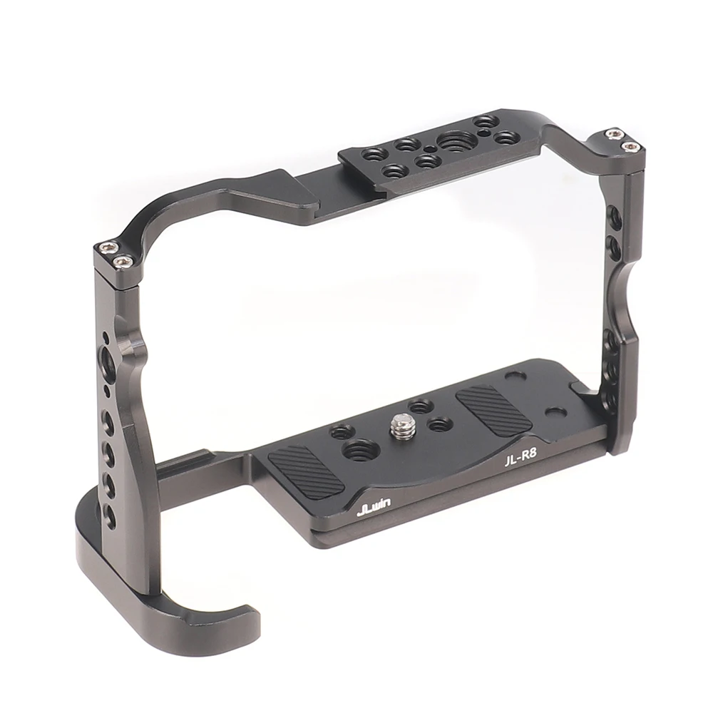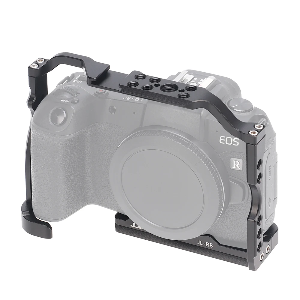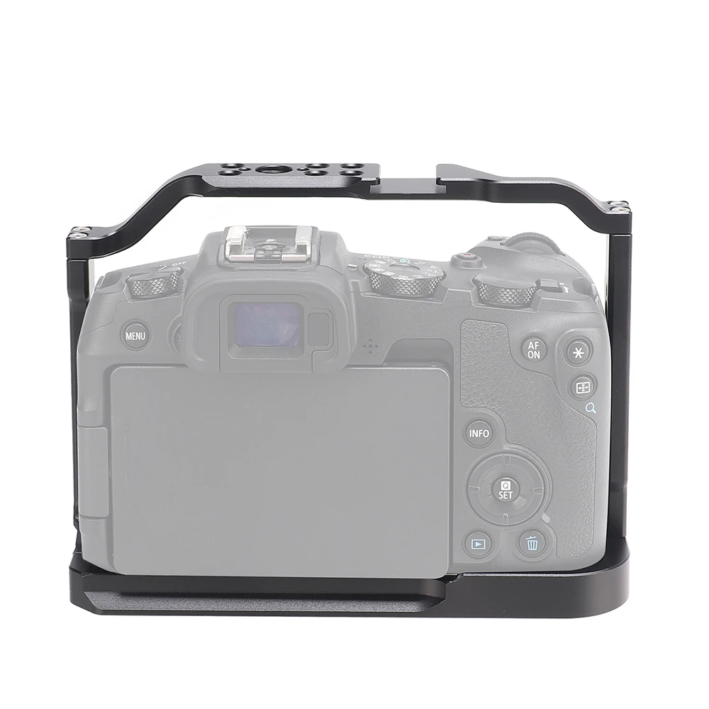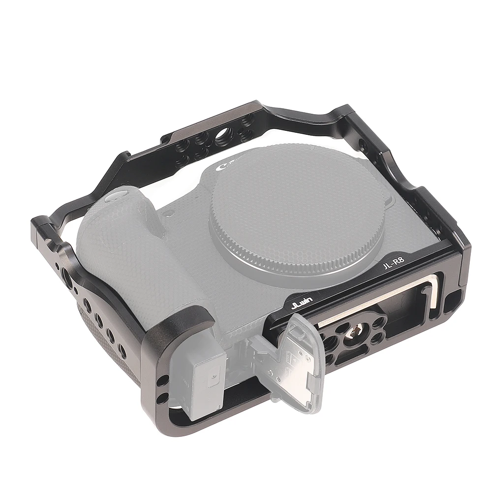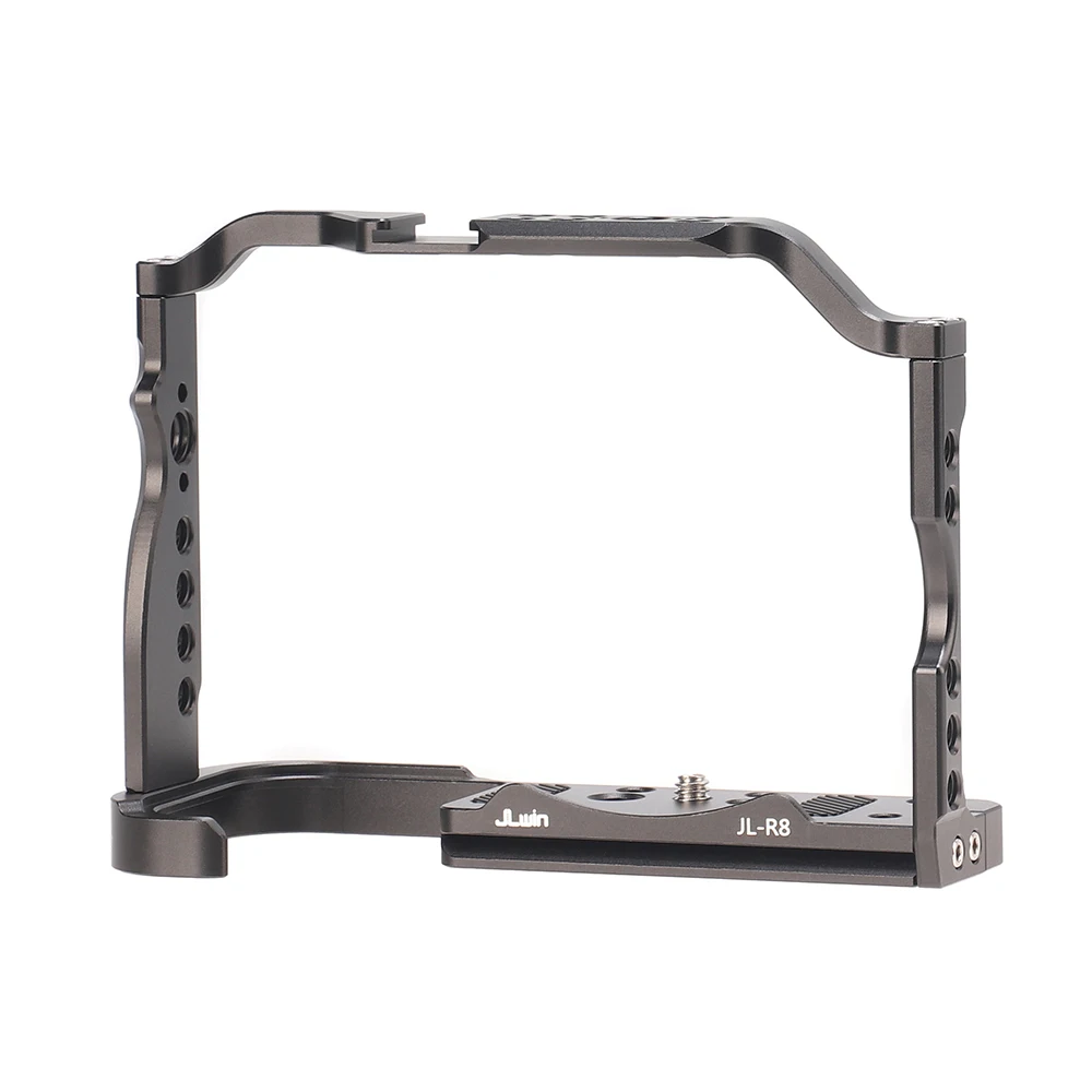 Aluminum Camera Cage is specifically designed for Canon EOS R8 Camera. It is a full cage which is lightweight and perfectly form-fitting the camera. It is equipped with multiple 1/4" -20 and 3/8" -16 threaded holes, ARRl locating hole and cold shoe for accessories mounting.