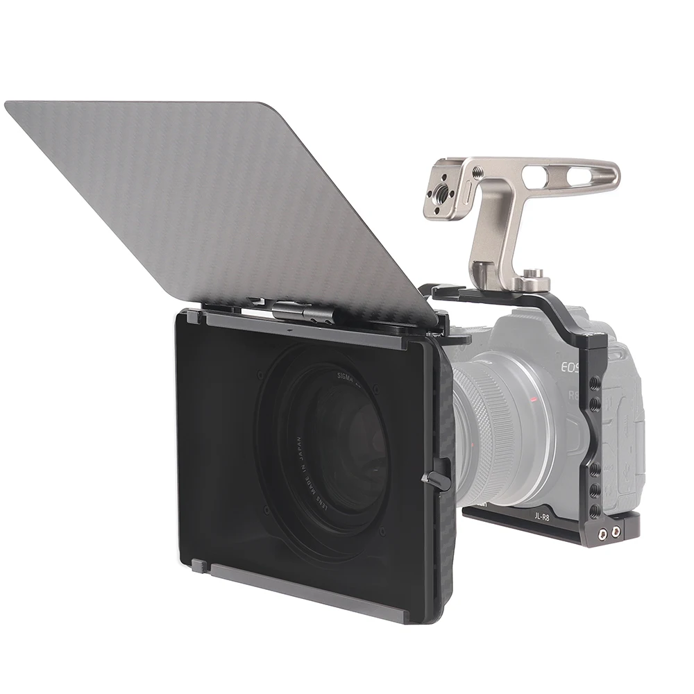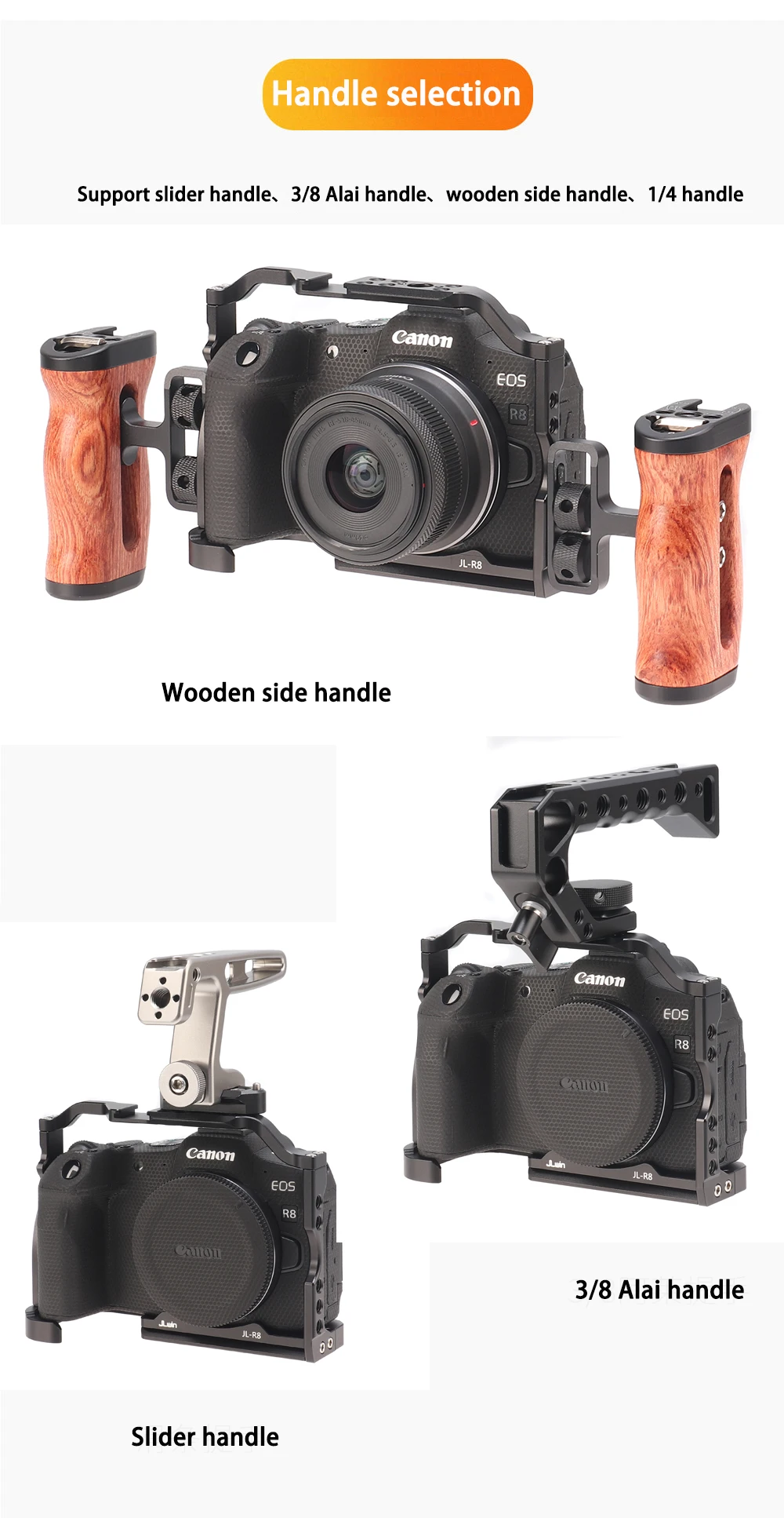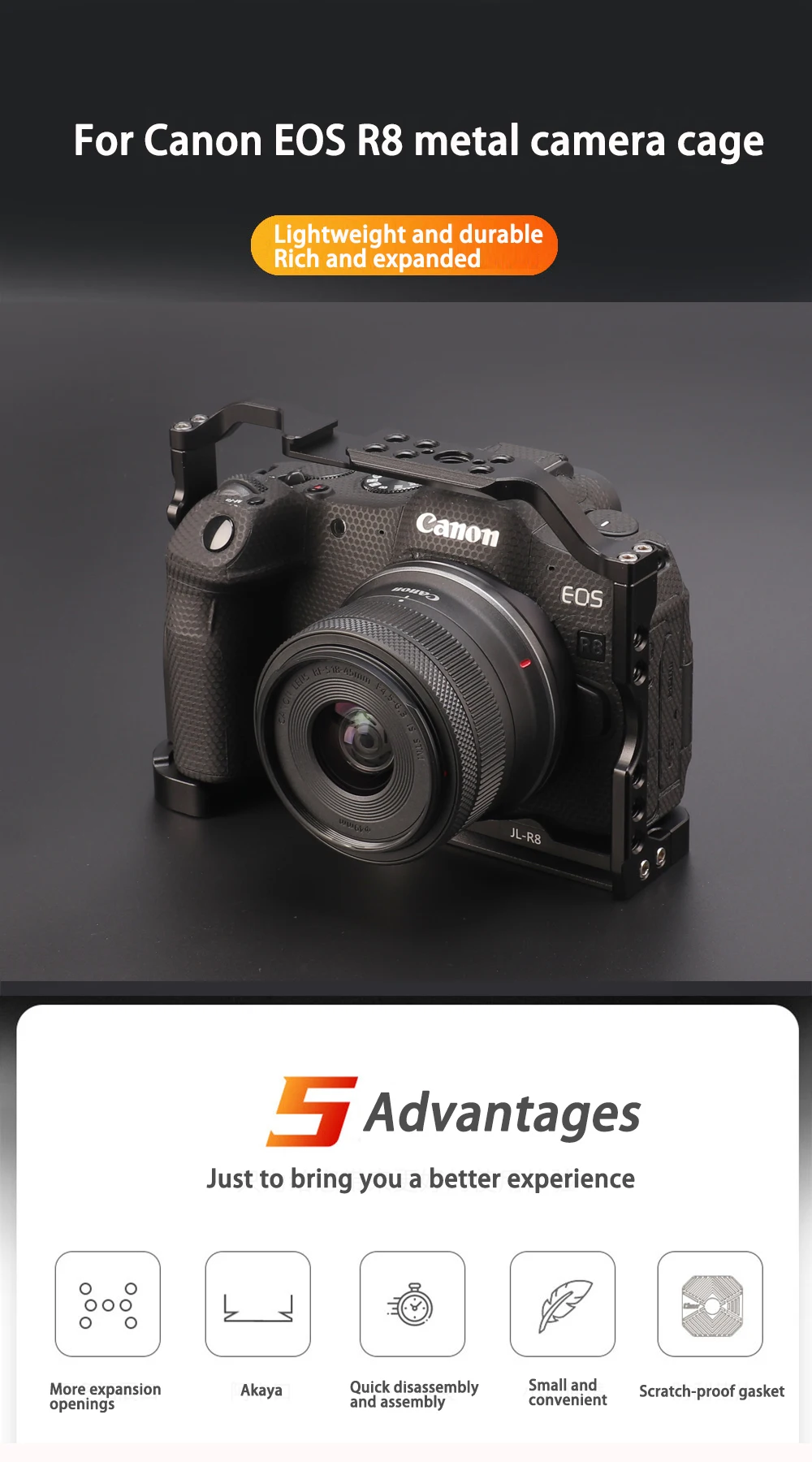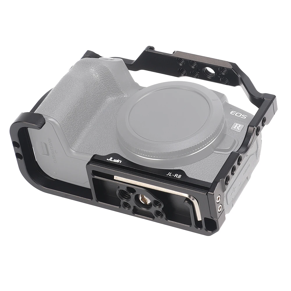 Aluminum Camera Cage is specifically designed for Canon EOS R8 Camera. It is a full cage which is lightweight and perfectly form-fitting the camera. It is equipped with multiple 1/4" -20 and 3/8" -16 threaded holes, ARRl locating hole and cold shoe for accessories mounting.