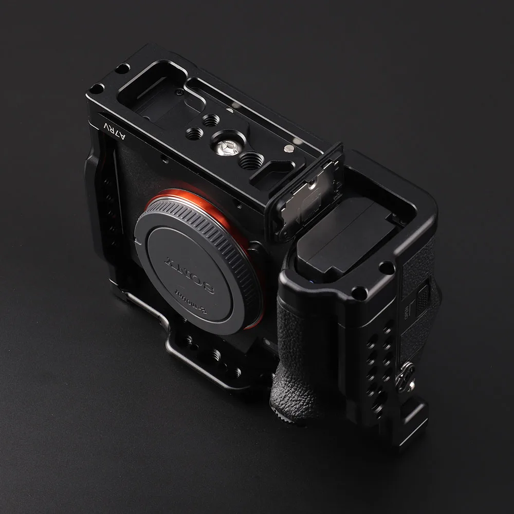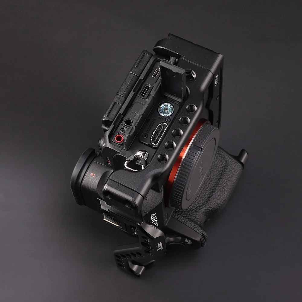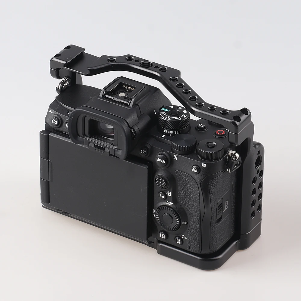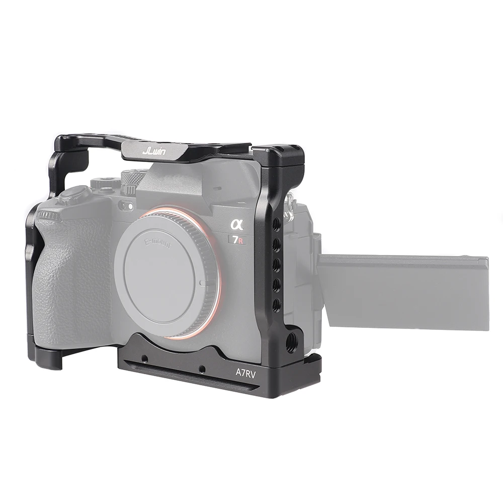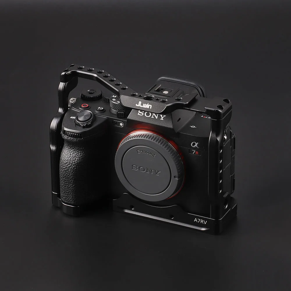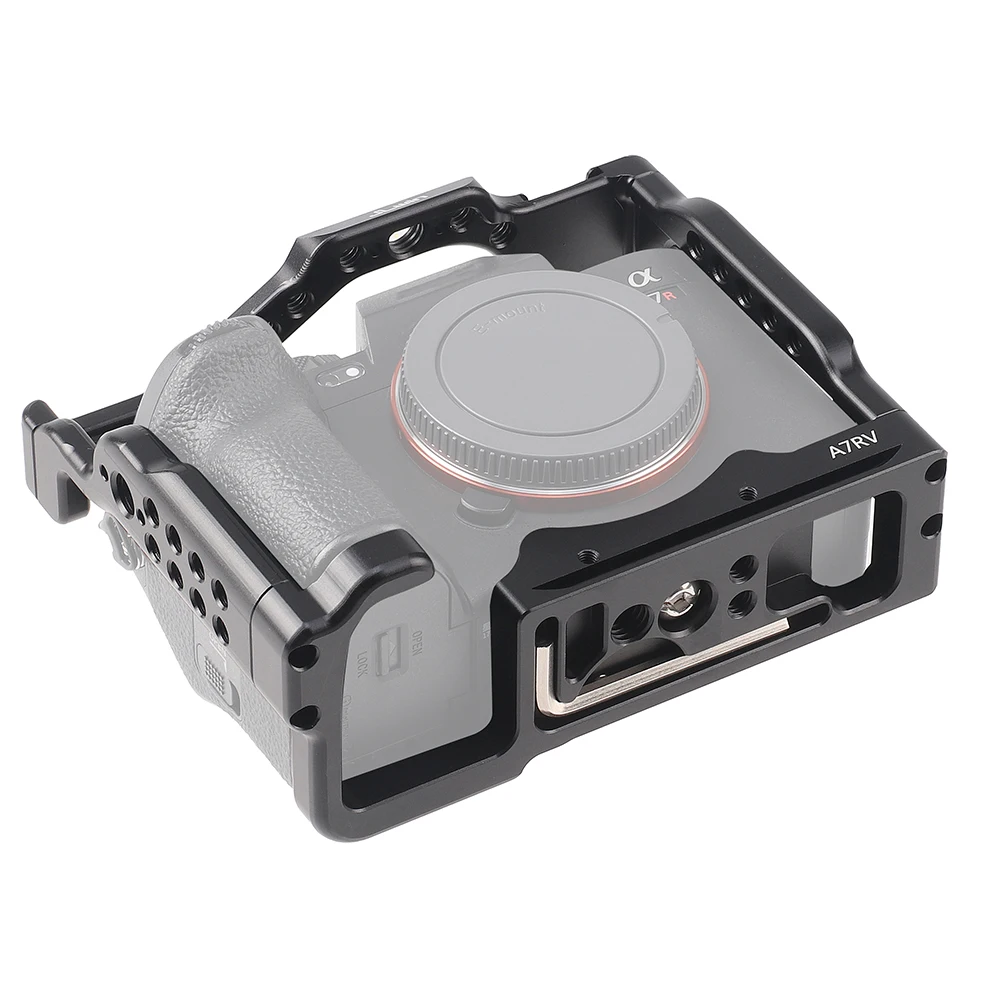 Aluminum Camera Cage is specifically designed for Sony A7RV Camera. It is a full cage which is lightweight and perfectly form-fitting the camera. It is equipped with multiple 1/4" -20 and 3/8" -16 threaded holes, ARRl locating hole and cold shoe for accessories mounting.