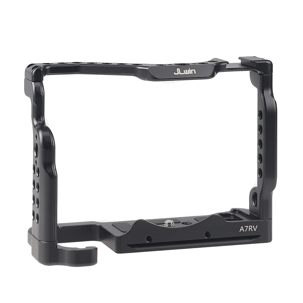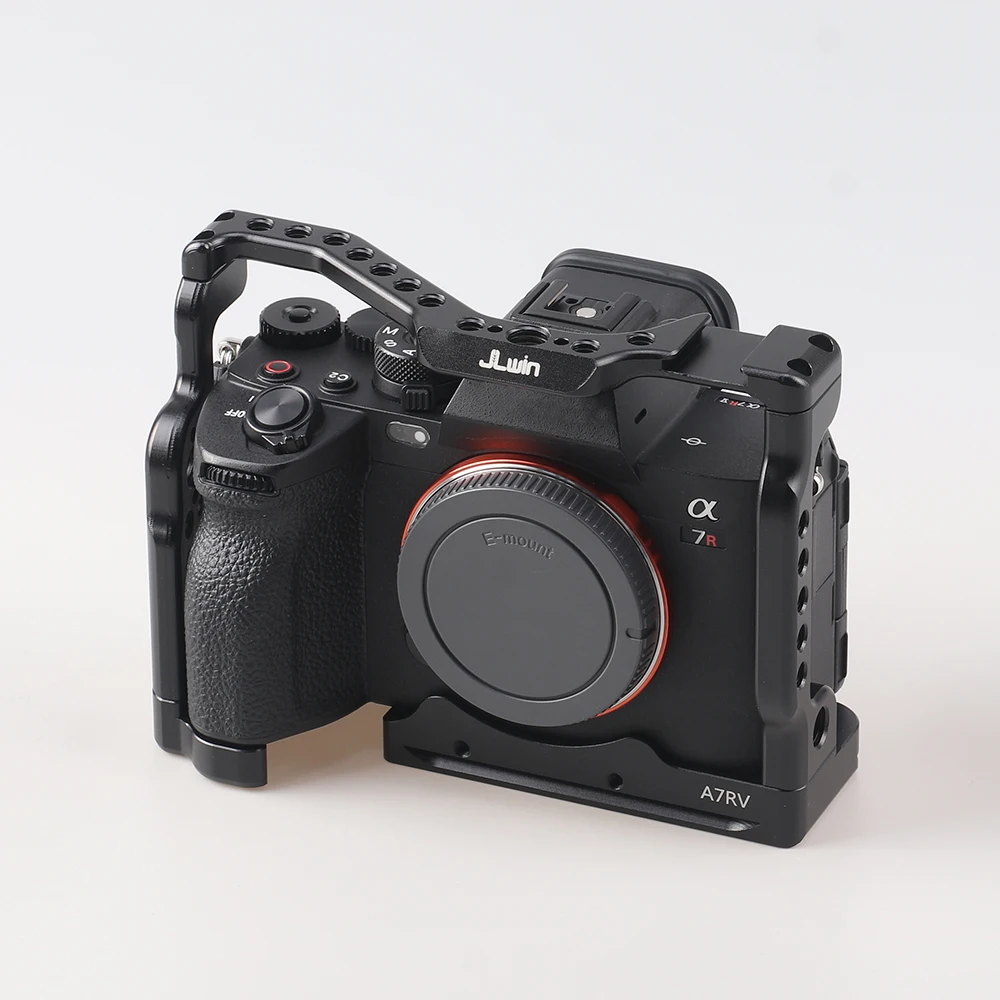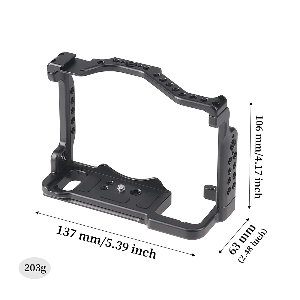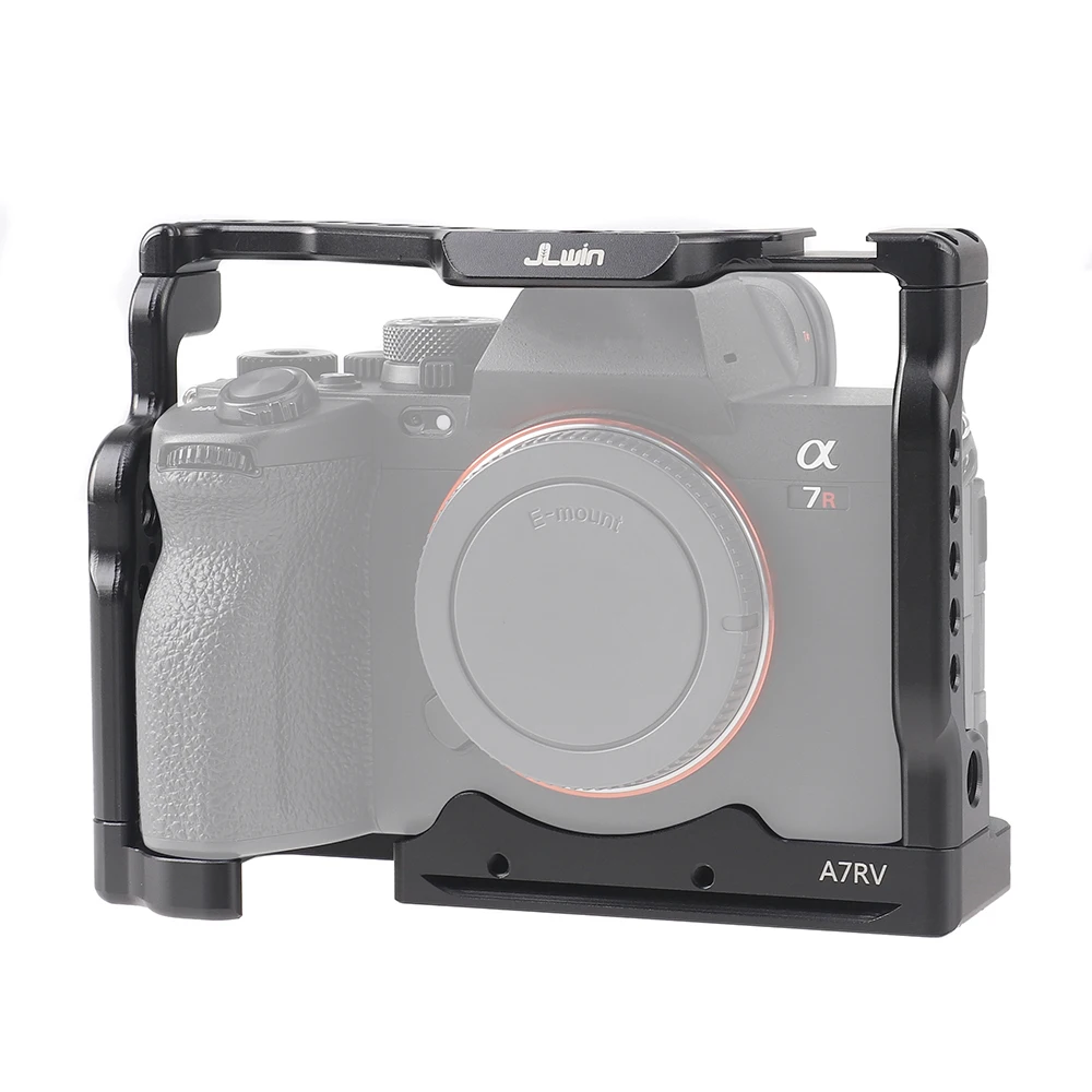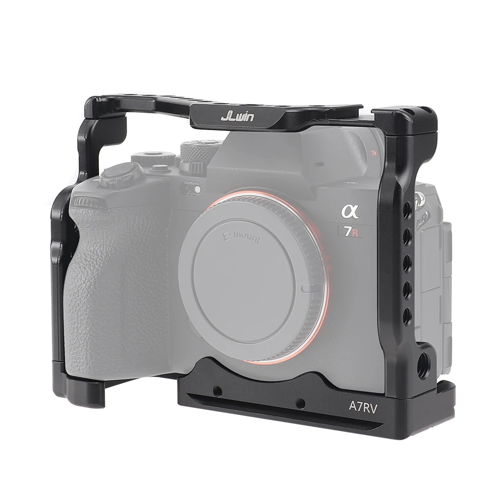 Aluminum Camera Cage is specifically designed for Sony A7RV Camera. It is a full cage which is lightweight and perfectly form-fitting the camera. It is equipped with multiple 1/4" -20 and 3/8" -16 threaded holes, ARRl locating hole and cold shoe for accessories mounting.