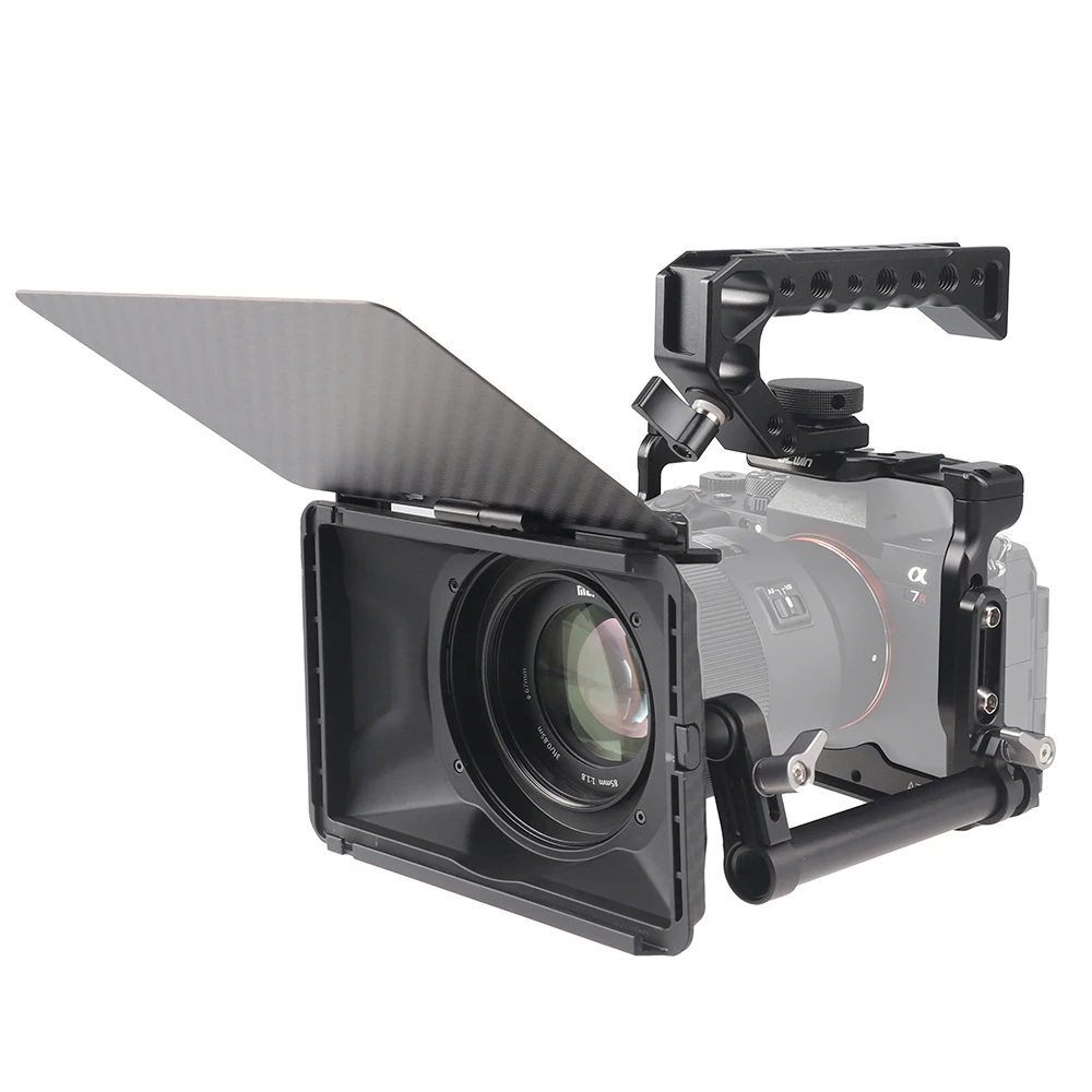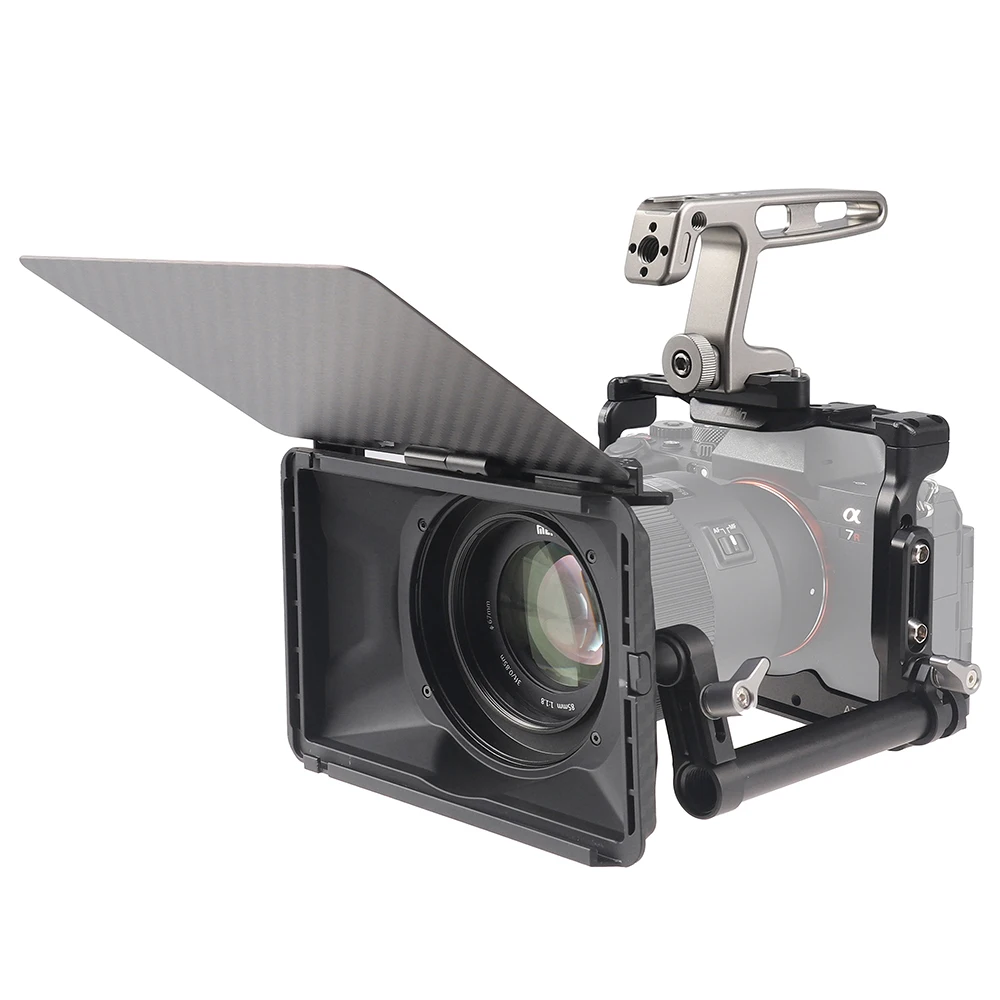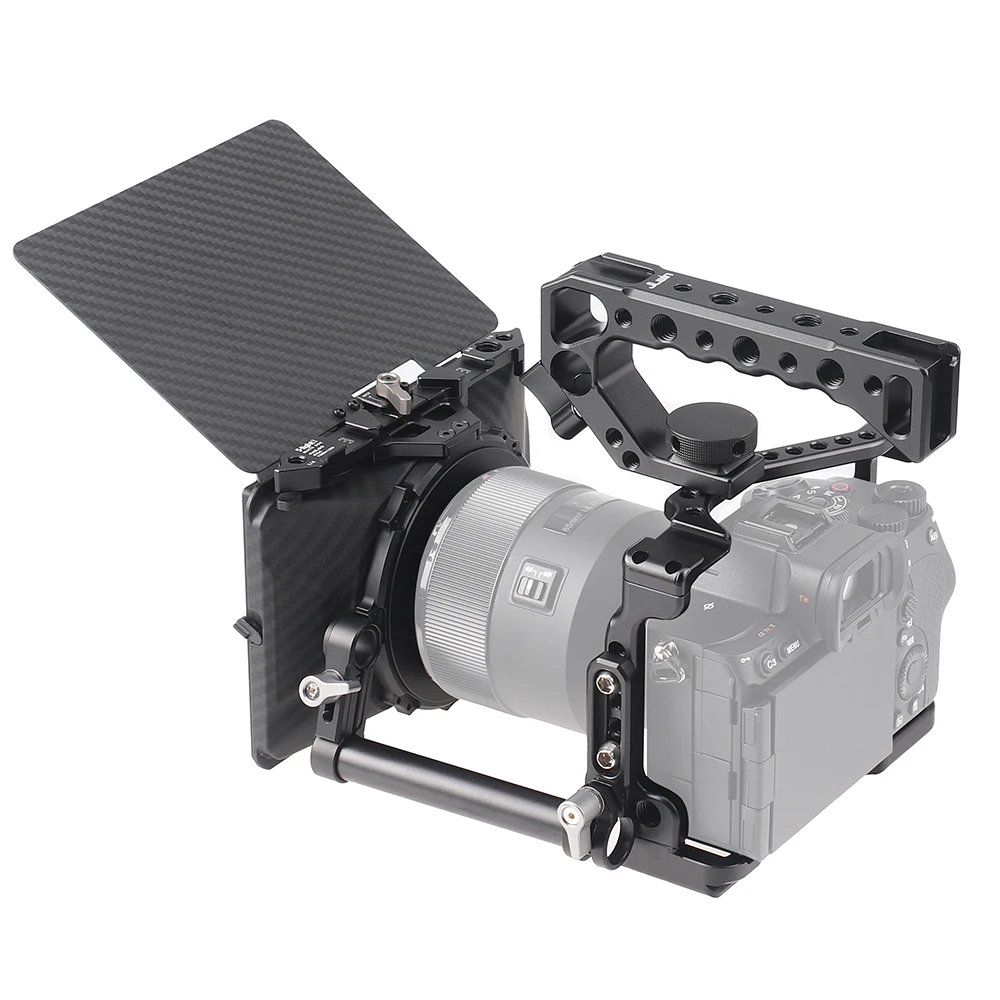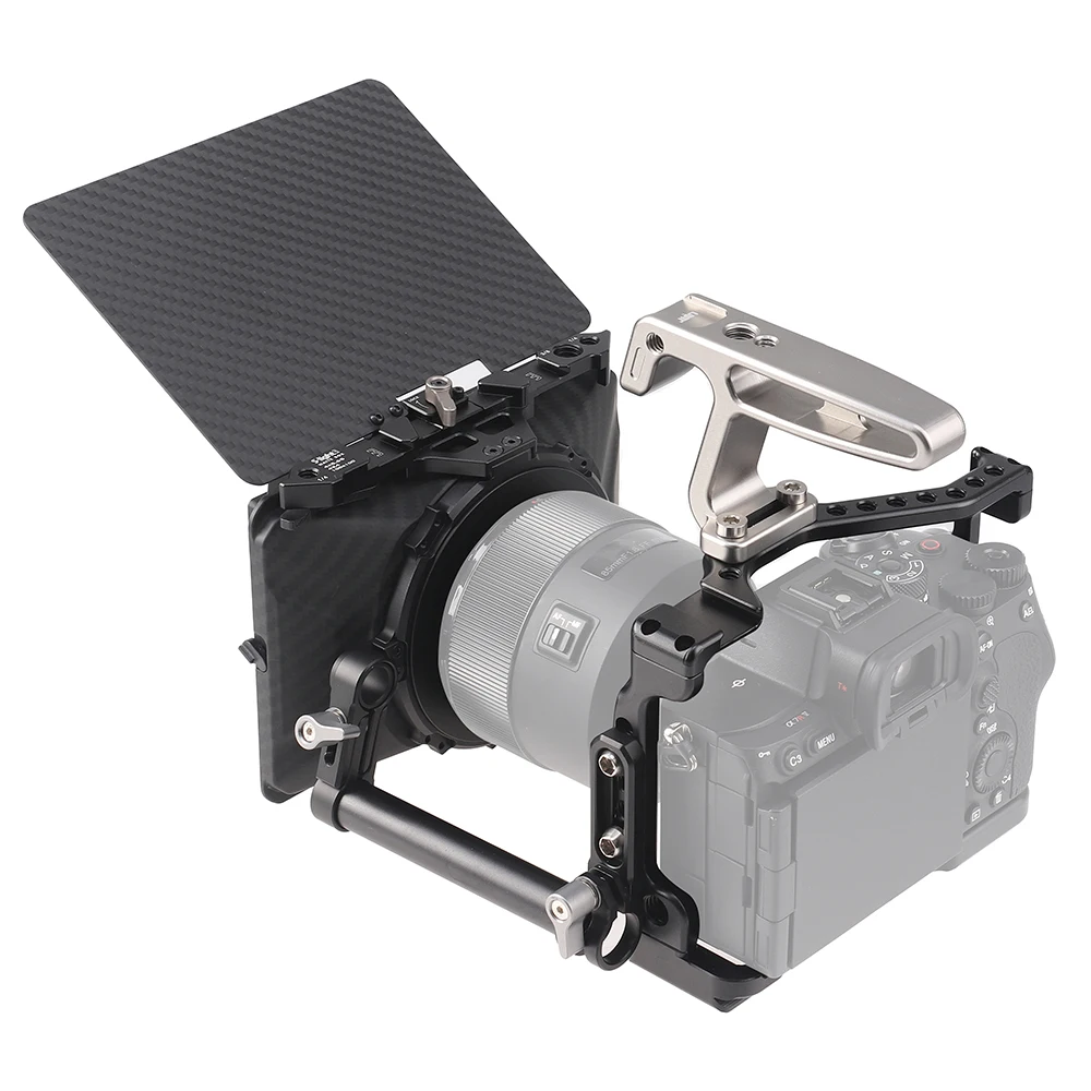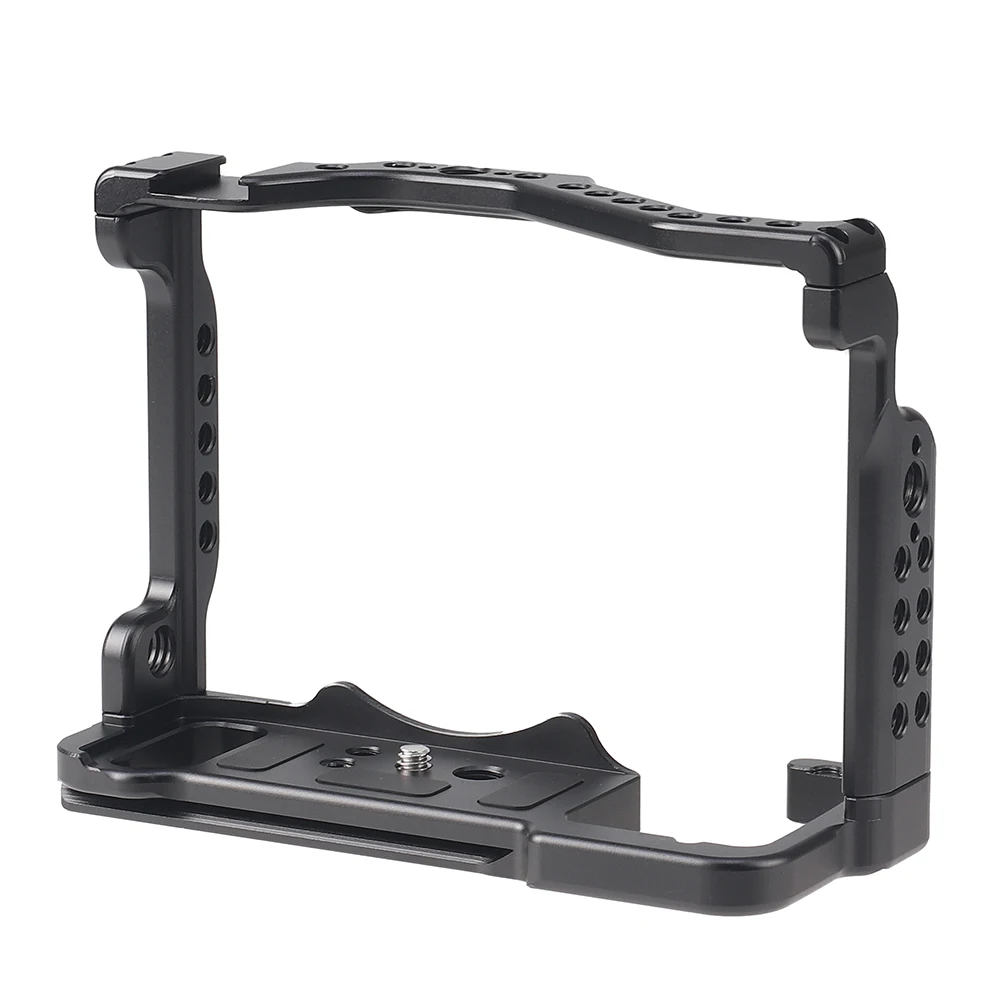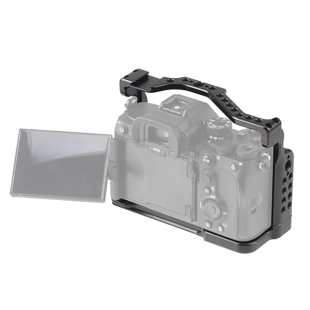 Aluminum Camera Cage is specifically designed for Sony A7RV Camera. It is a full cage which is lightweight and perfectly form-fitting the camera. It is equipped with multiple 1/4" -20 and 3/8" -16 threaded holes, ARRl locating hole and cold shoe for accessories mounting.