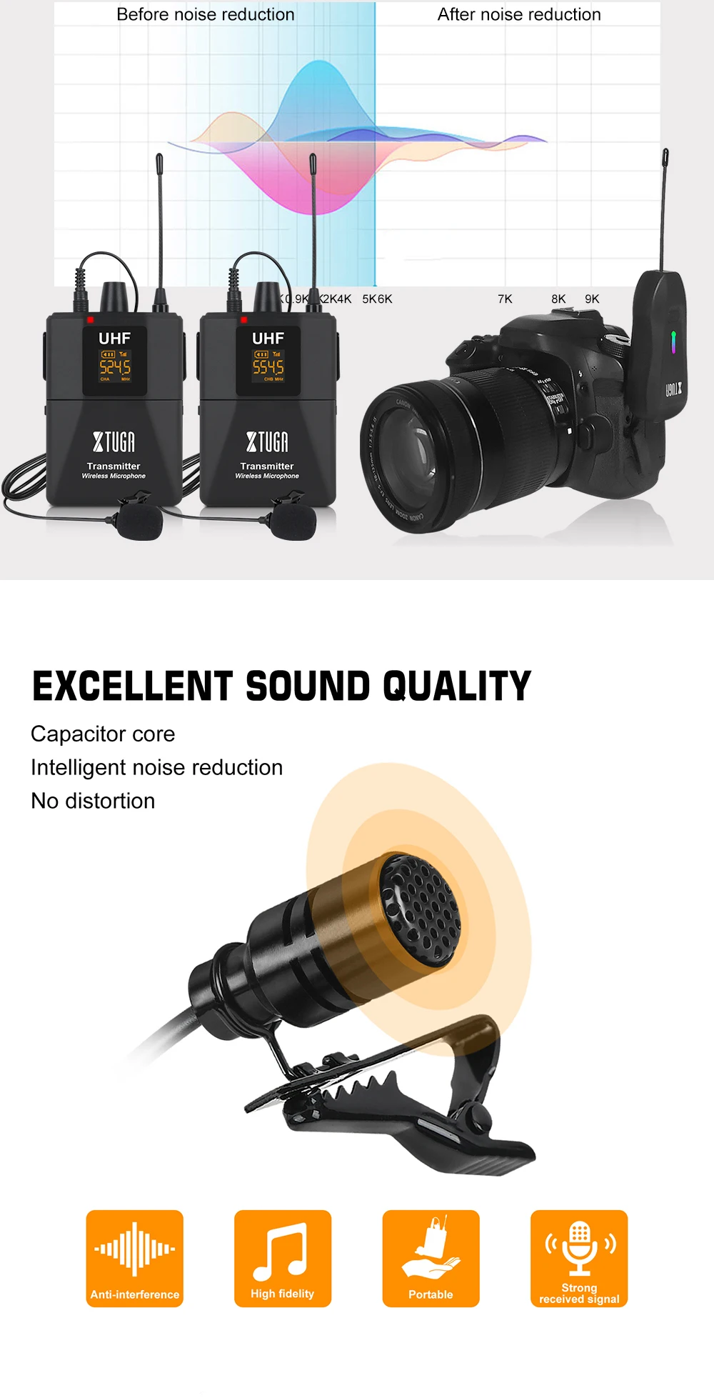 1.Wireless microphone system with powerful and stable signals, using UHF frequency band, With 30 selectable channels in the 520-580 MHz frequency range,for interference-free operation, wireless range up to 50 meters (164 feet).(With Monitoring Function and intelligent noise reduction)