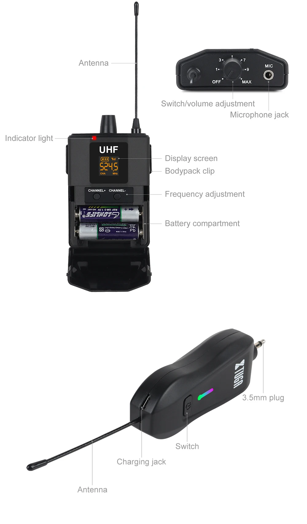 2.New added accompaniment function,the transmitter has a new AUX input,which acts as a accompaniment function when used with a mobile phone.