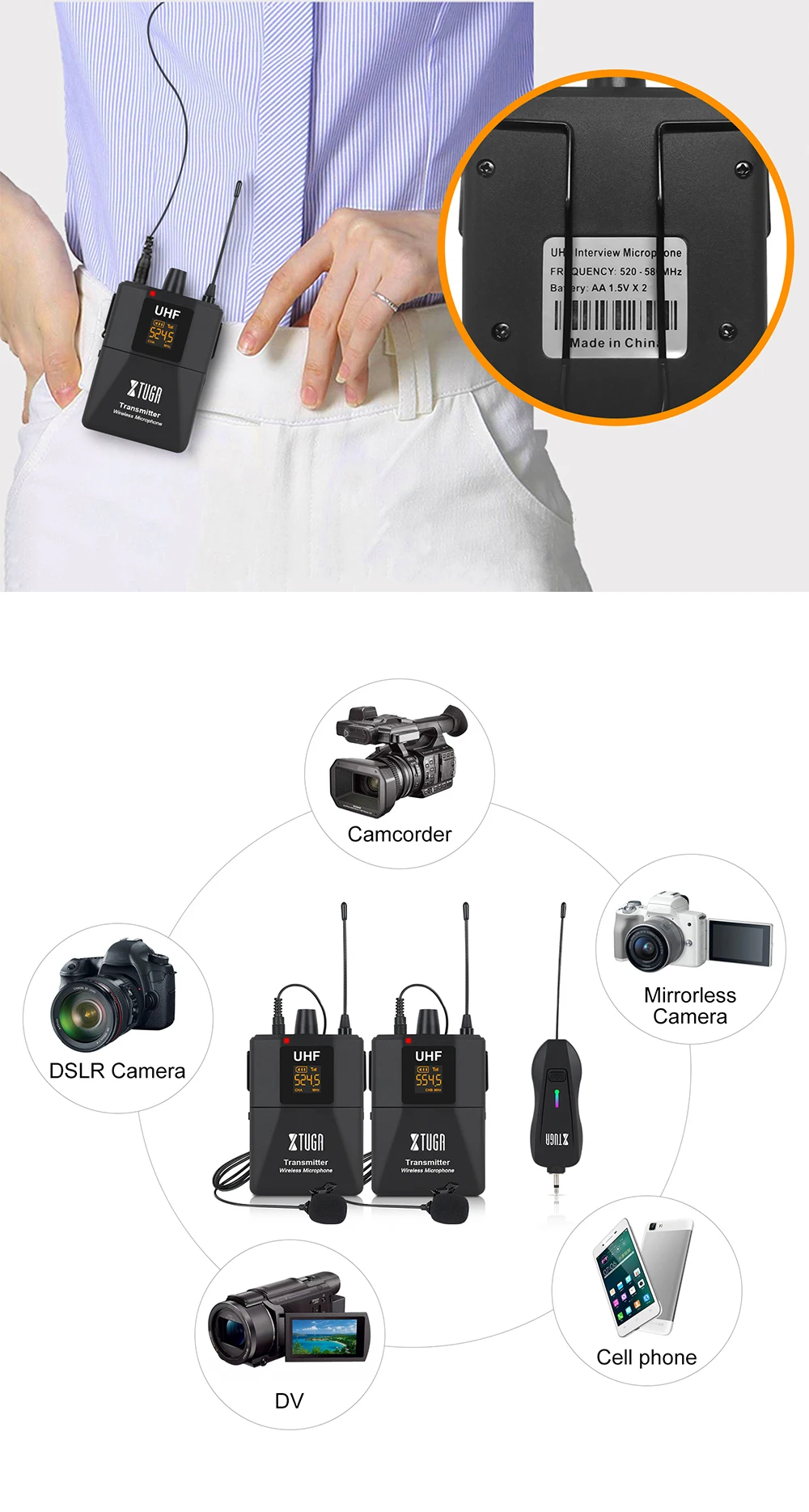 6.Receiver with 3.5mm interface, comes with two 3.5mm cable, it can work with your laptop/PC/DSLR/Camera/Amplifier/DV/Camcorder/Smart phone/Mixer, etc.