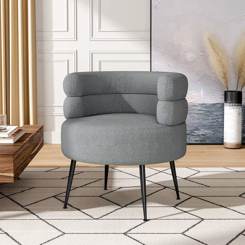 finish. This teddy bear fur upholstered barrel chair is both comfortable and