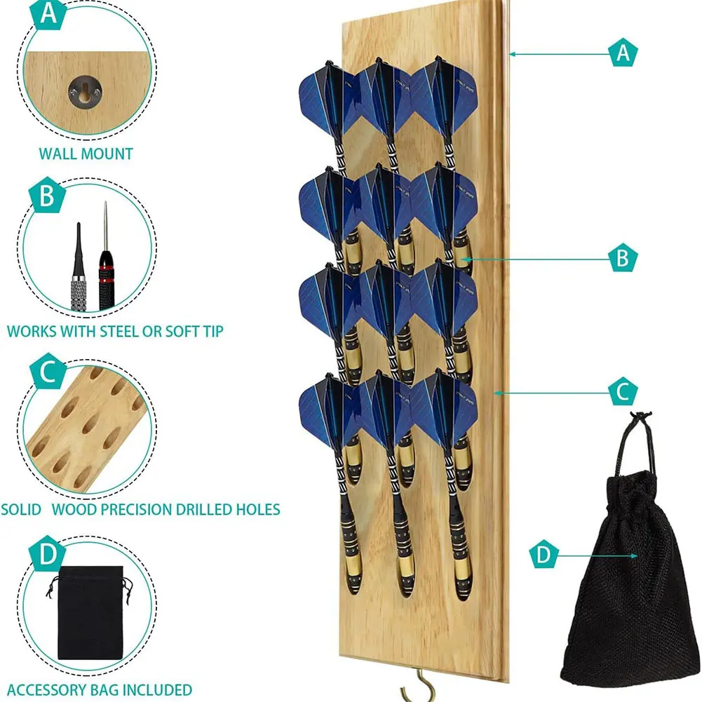 Dart Holder/Stand Solid Wood Wall Mounted Dart Display & Stand with Accessory Storage Bag Dart Storage Display Rack Displays 12 Steel/Soft Tip Darts