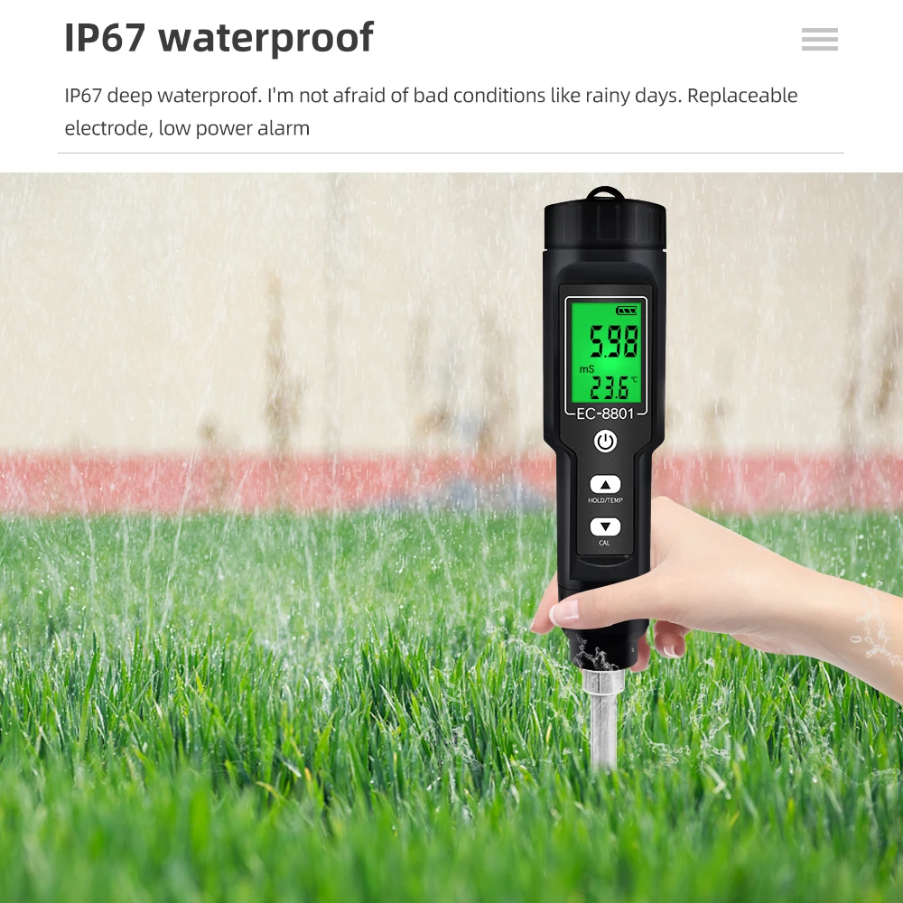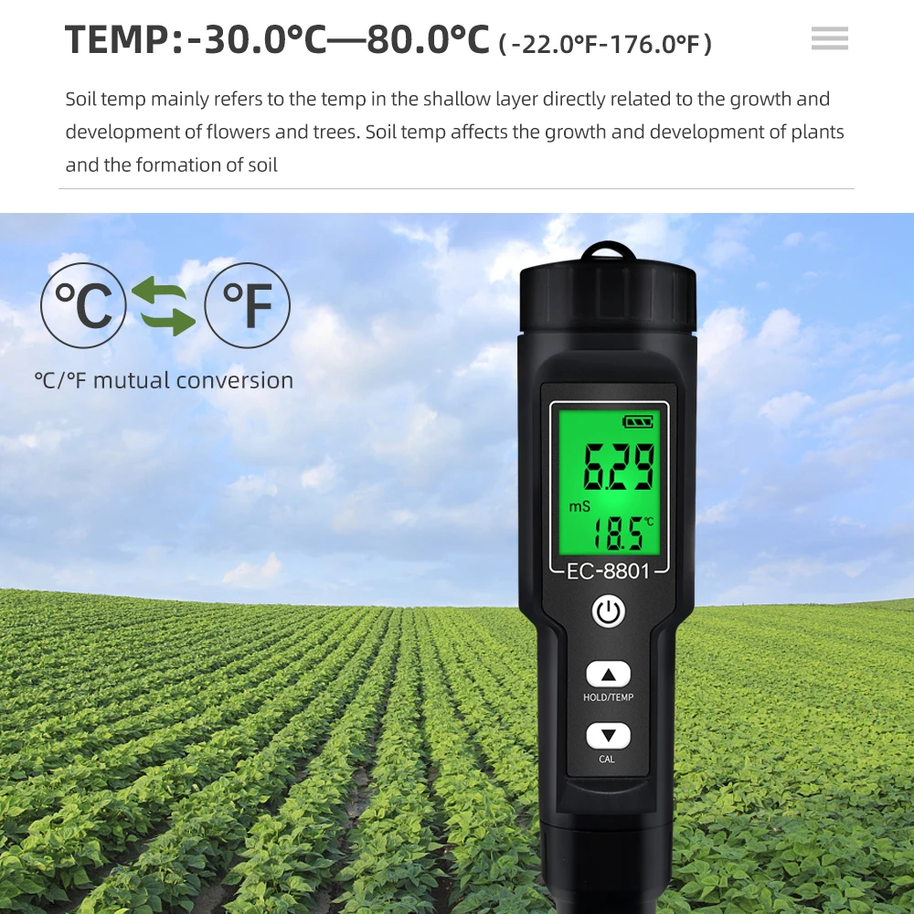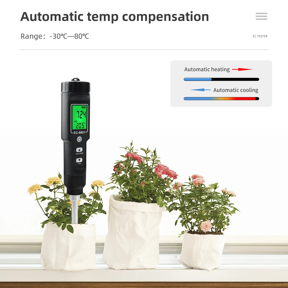 EC-8801A/EC-8801BB soil EC tester, CE certification, quality guaranteed. Large-screen LCD display, plug and play, clear and quick measurement data. Automatic temperature compensation, accurate data, measurable EC (0.00-10.00ms/cm), widely used in greenhouse planting, gardening planting, farmland planting, laboratory, agriculture, pot planting, etc.
