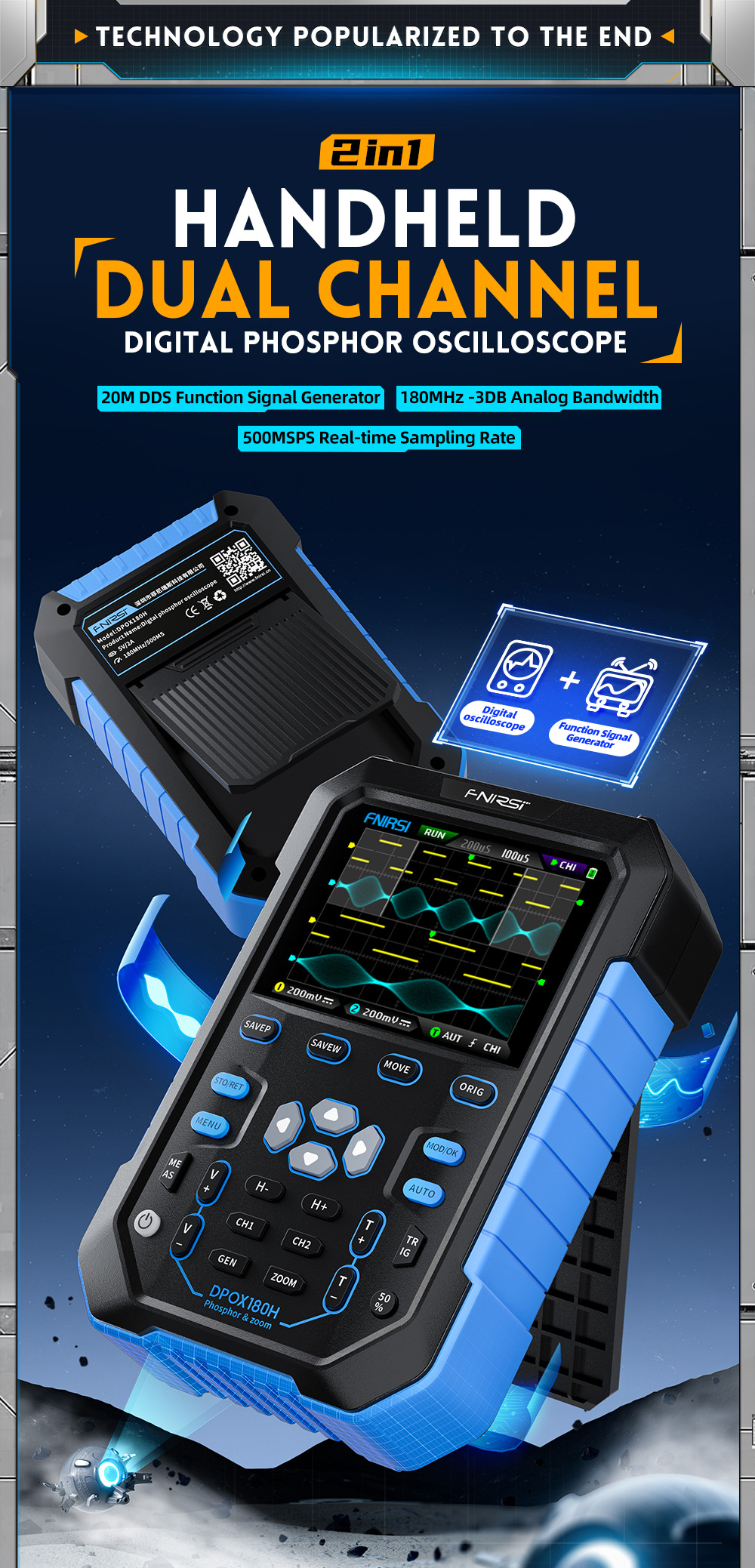 DPOX180H is a cost-effective handheld dual-channel digital phosphor oscilloscope launched by FNIRSI with a two-in-one oscilloscope and signal generator. The oscilloscope has a real-time sampling rate of 500MSPS and an analog bandwidth of 180MHz. In terms of display, a high-contrast 2.8-inch IPS full-vision LCD screen and digital fluorescent technology are used. The waveform display effect is good, and the colorways are grayscale and color temperature. With a waveform refresh rate of up to 50000wfm/s, displaying abnormal signals with low probability is easier. The time-based system includes a ZOOM time base for easy analysis of digital protocol signals. With a vertical sensitivity as low as 5mV, it can better measure small signals of 5mVPP. Ultra-high signal-to-noise ratio, fully sealed shielding measures, stable circuit feedback design, clean and clear waveform. The original adjustable automatic bandwidth limit and adaptive adjustable trigger suppression are suitable for analyzing and measuring signals with relatively large noise. 20M hardware bandwidth limit, can filter out noise above 20MHz. The trigger adopts digital trigger technology with high precision. It has three trigger modes: automatic/single/normal. It has a strong ability to capture periodic signals, burst signals, and protocol signals. The DDS signal generator has 14 kinds of function signal waveforms and a free-customized chopping waveform. The frequency of the sine wave can reach up to 20MHz, and the other waveforms can reach up to 10MHz. The original chopping output function can store up to 500 customized signals. It has three time base modes YT, XY, and rolling. Manual cursor measurement is suitable for measurements with large noise signals. Efficient one-button automatic adjustment, adaptive 25%, 50%, 75% electric level trigger only takes 2 seconds to measure 1VPP/1KHz. Save waveforms and screenshots with one key, up to 250 sets of waveform data or 90 pictures can be stored, and 500 intercepted wave data can be stored at the same time. The data browser can browse and view the currently saved waveform data and pictures, and the waveform data supports operations such as zooming and moving. High voltage anti-burning protection, all gears can withstand high voltage up to 400V. USB data export, you can connect to a computer to copy picture files and copy system files to the oscilloscope for system upgrades. 5V2A fast charging and 1 hour can charge to 80%.