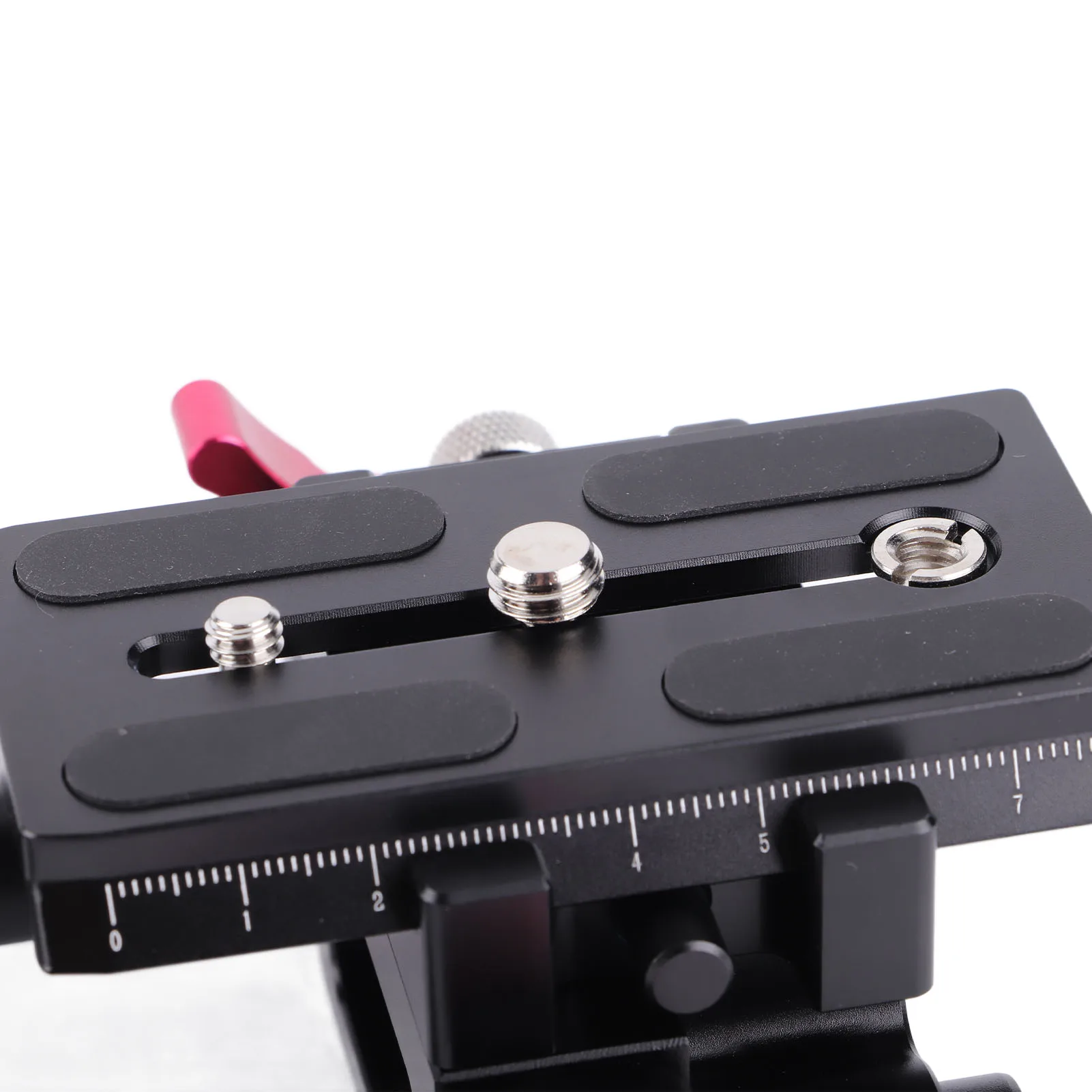 4. MONTAJE DEL TRIPODE: la parte inferior de la placa base y las abrazaderas de la varilla Tienen orificios roscados de 1/4 y 3/8 pulgadas, que permiten la conexion directa al tripode o al carro u otro equipo, ayudando a proporcionar flexibilidad para una variedad de propositos de disparo, compatible con tripodes como Manfrotto 577, 501, 504, 701, etc.