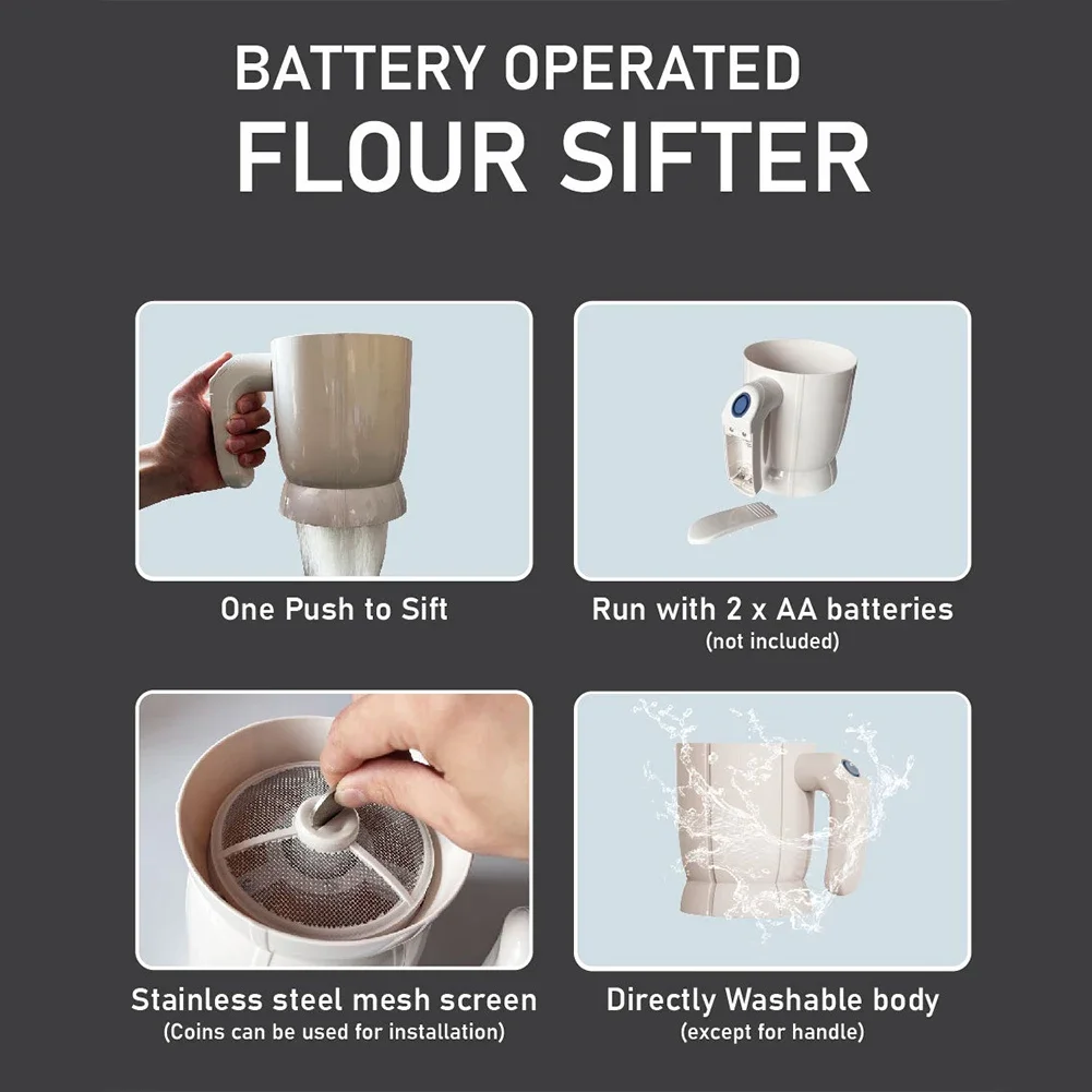 2.Convenient Battery-Powered Operation: Designed with battery-powered functionality, this baking sifter provides easy and portable operation. It eliminates the constraints of wires and power outlets, offering flexibility in the kitchen, allowing you to effortlessly sift ingredients and achieve consistent results during baking.