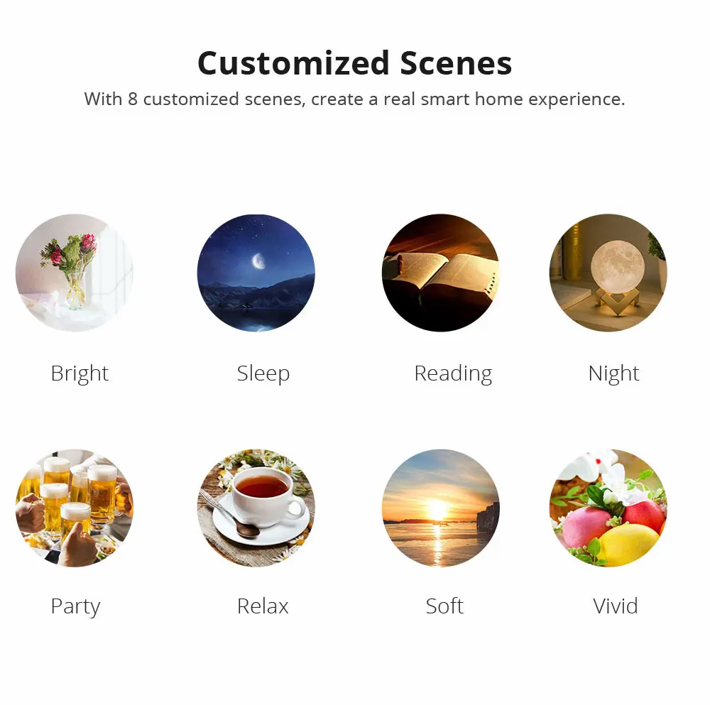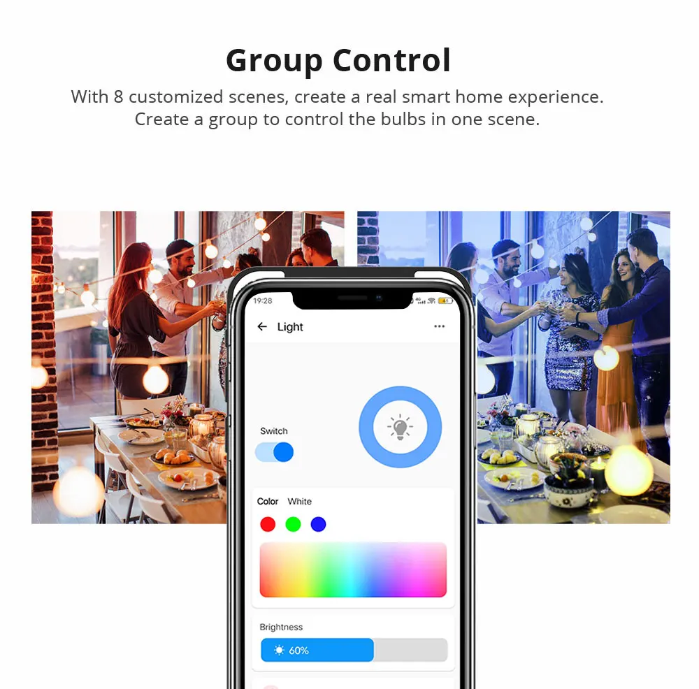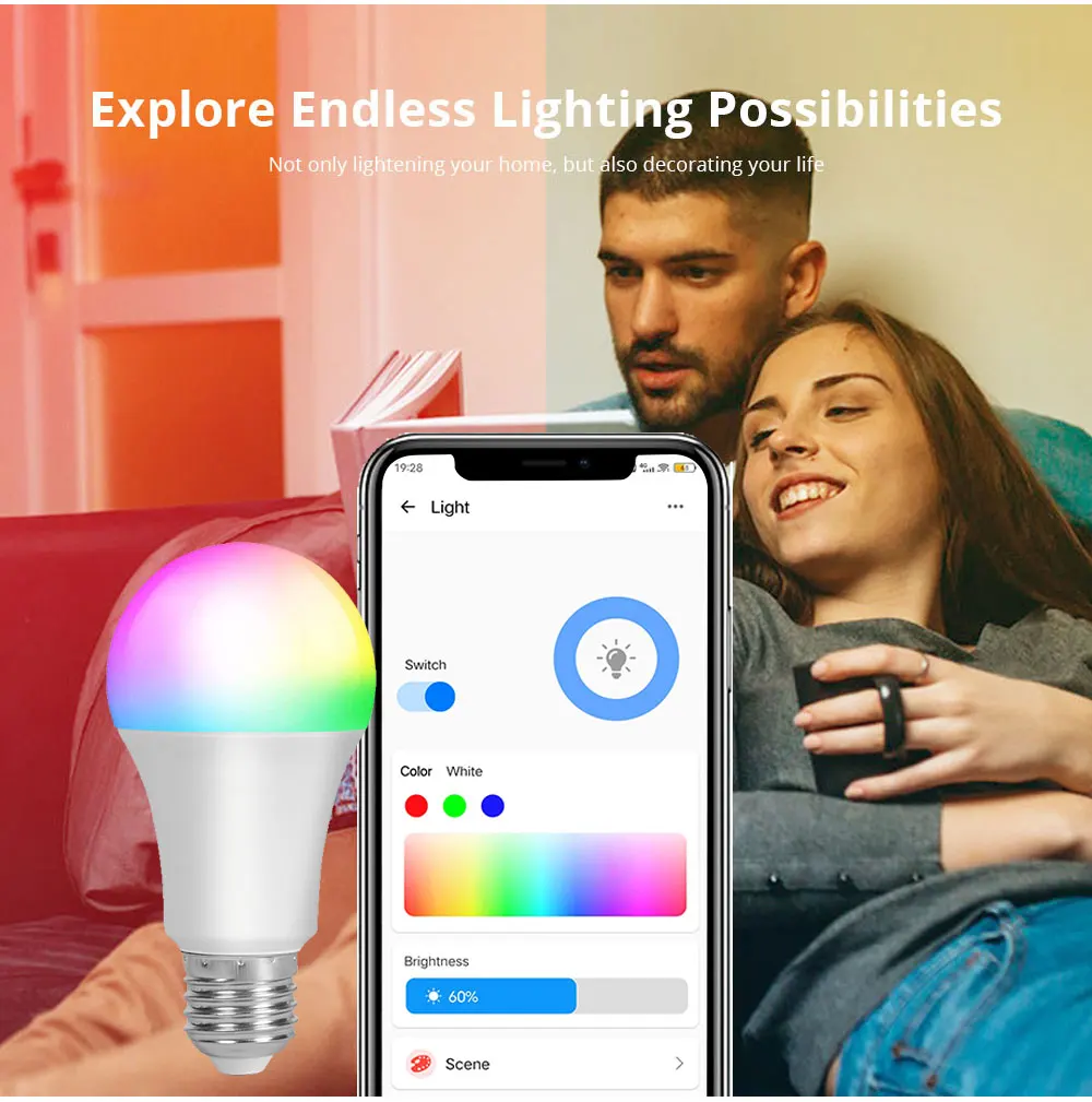 White light warm light, light and dark adjustment, 16 million colors RGB full color adjustable,easily changed by your mood.You can change the color from red to green,even change the light from dim to bright. And the bulb can be used anywhere you need colorful light with smart control.Such as home,hotel,meeting room,restaurants,bar,cafe, holiday decoration,birthday party.Intelligent scene linkage, preset scene one-click execution to meet your different demand.