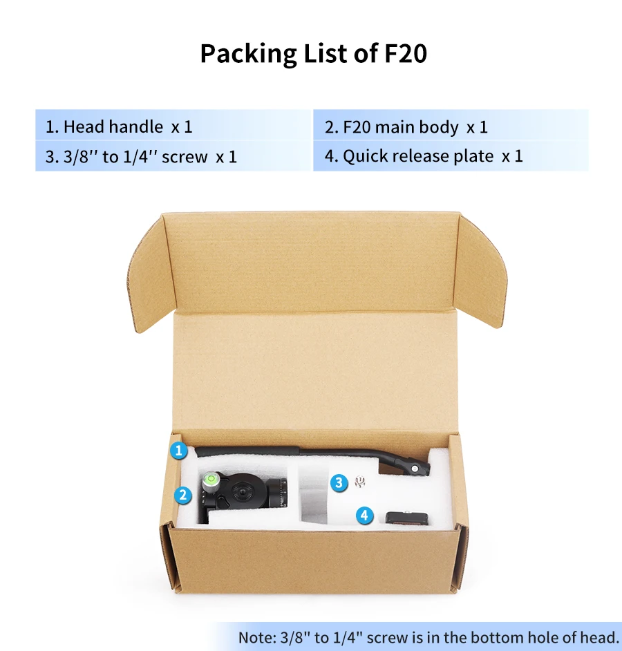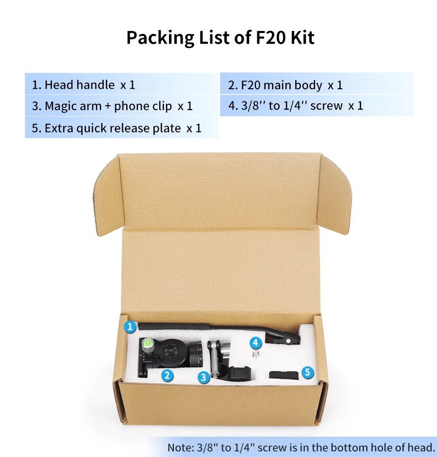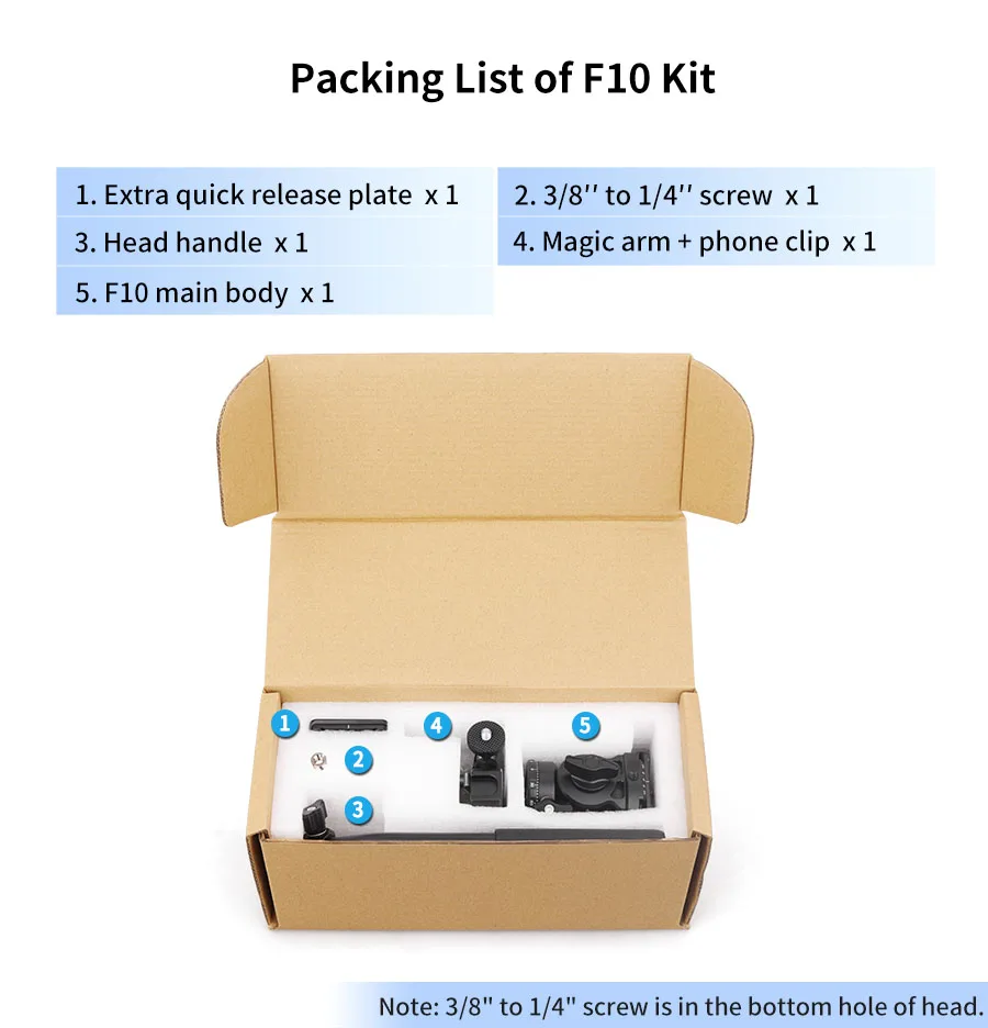 Practical Kit If you buy the F10/F20 Kit, there is an Arca Swiss quick release plate for install and remove, so that you can switch different devices between handheld and tripod quickly and greatly improve using experience. The F10/F20 Kit also with a magic arm and a phone clip together, you can use a phone (width bewteen 5.9cm/2.32" to 9.4cm/3.70") to shooting at the same time.If you don't need the extra aaccessories, you can also chose the Only F10/F20.