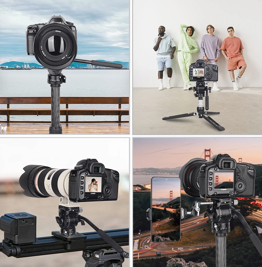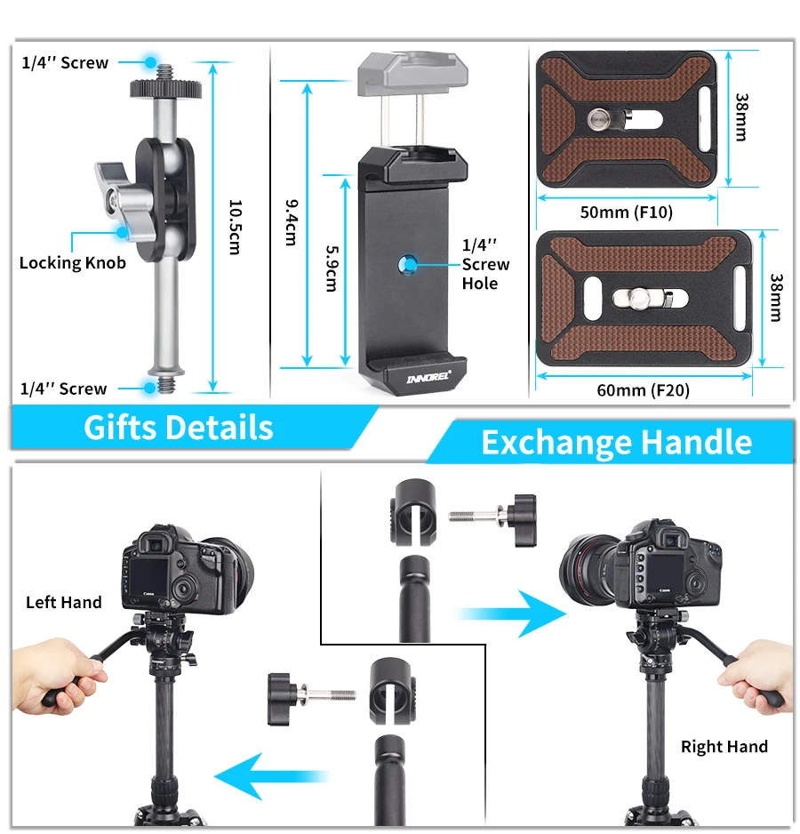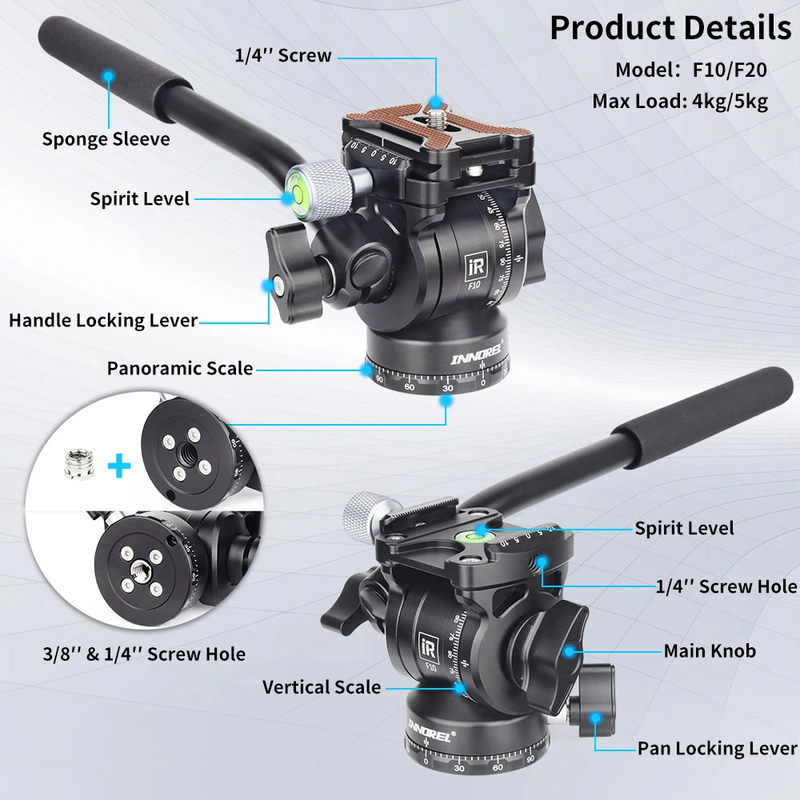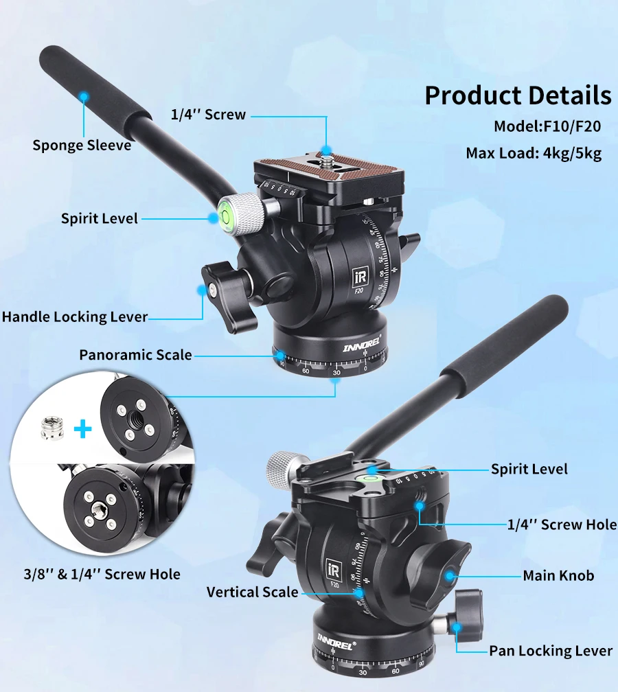 Wide Compatibility F10/F20 has a standard 1/4" top screw (adapt for digital SLR cameras, mirrorless cameras, compact video cameras...) and 3/8" bottom screw hole (compatible with most tripods, monopods and table holders), load capacity up to 4kg/5kg. There is a 1/4" screw hole of clamp side, you can add extra equipments on it (such as a phone) to achieve multiple devices photography.