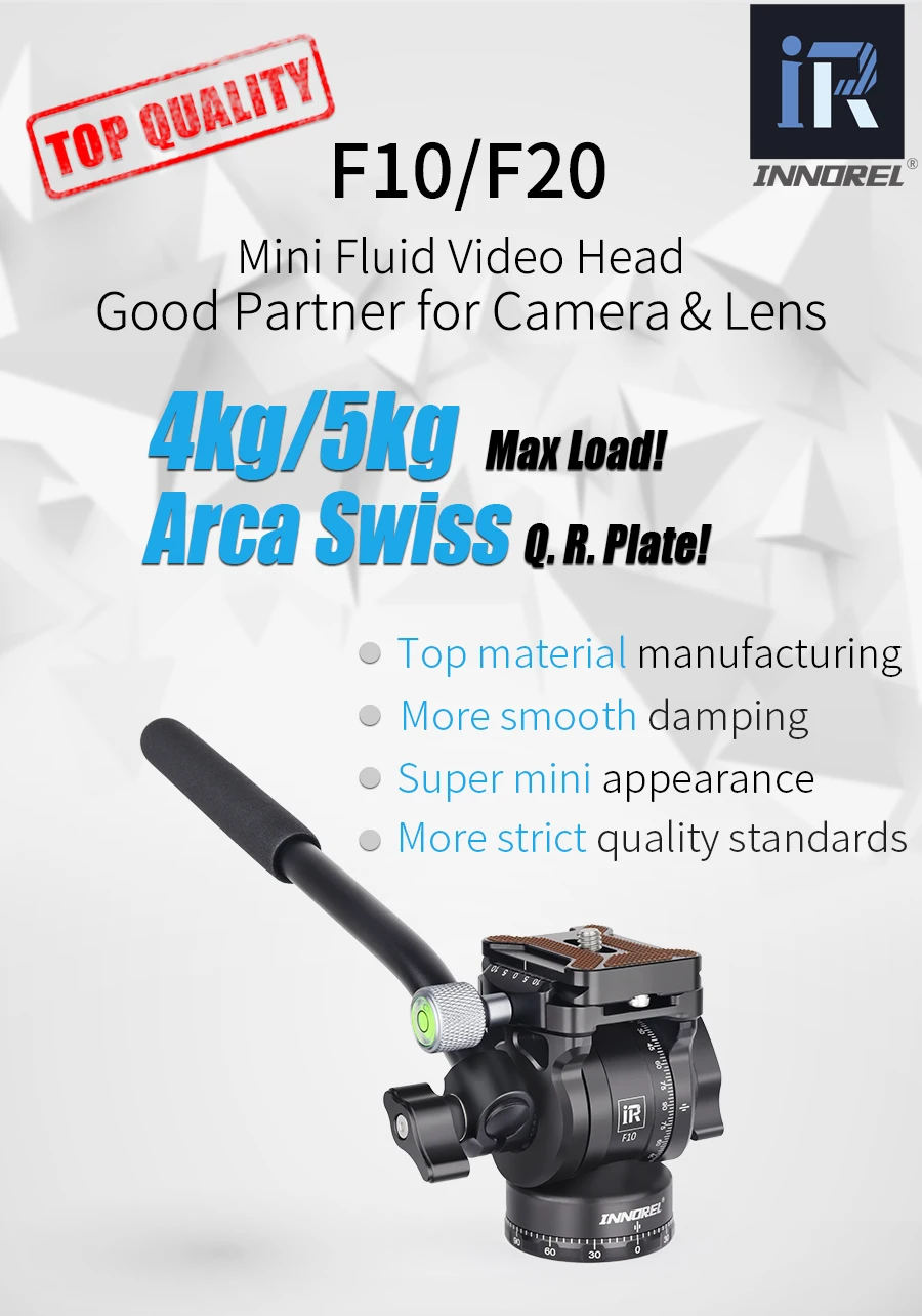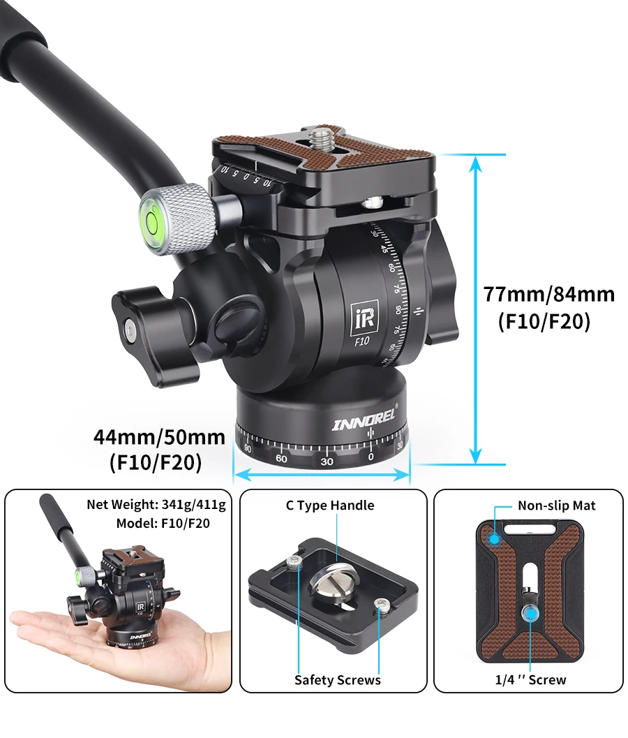 Compact & PortableF10/F20 is a compact fluid video head, measuring only 77mm/84mm in height, weighs only 341g/411g and a 44mm/50mm diameter base. The tripod fluid head is made of CNC aluminum alloy with a textured feel and is more durable. Super mini appearance, very handy and easy to take it for travel or mini video.