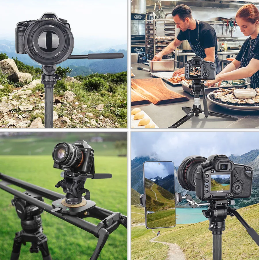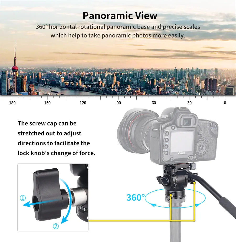 Excellent Details Comes with precise scales on bottom rotatable pan and tilt body, you can shoot at a fixed point easily. The screw caps of pan and handle locking levers can be stretched out to adjust directions to facilitate the lock knob's change of force, greatly improve using experience.